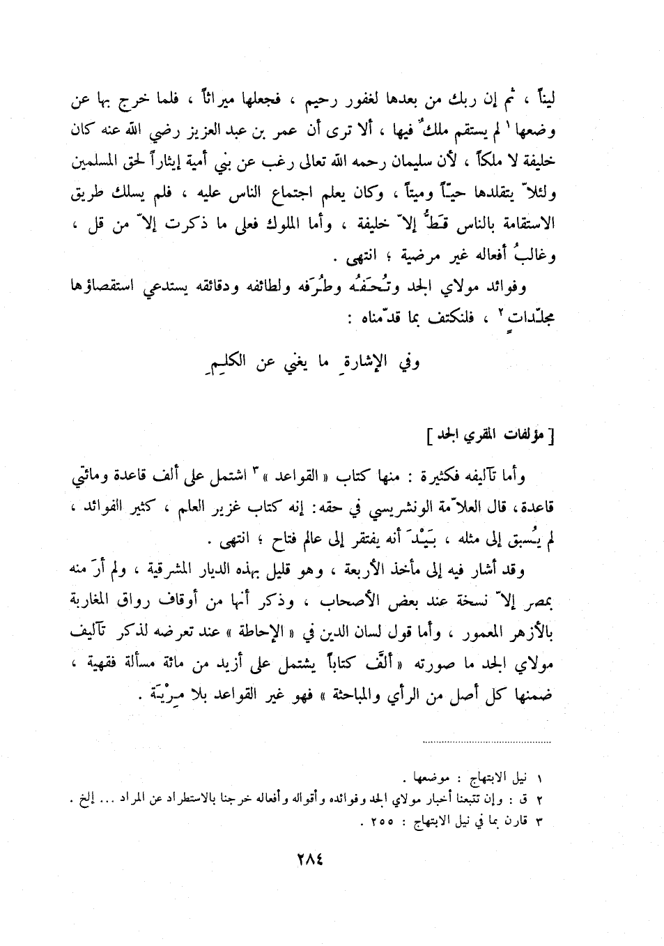 وقد أشار إليه في مأخذ الأربعة، وهو قليل بهذه الديار المشرقية، ولم أر منه بمصر إلا نسخة عند بعض الأصحاب، وذكر أنها من أوقاف رواق المغاربة بالأزهر المعمور، وأما قول لسان الدين في الإحاطة عند تعرضه لذكر تأليف مولاي الجد ما صورته ألف كتاباً يشمل على أزيد من مائة مسألة فقهية، ضمنها كل أصل من الرأي والمباحثة فهو غير القواعد بلا مرية.