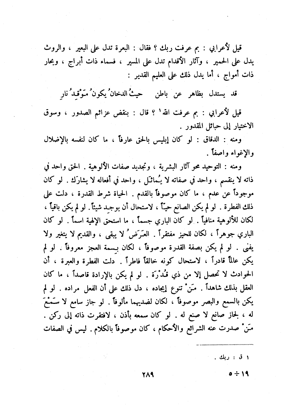 قد يستدل بظاهر عن باطن ... حيث الدخان يكون موقد نار قيل لإعرابي: بم عرفت الله (1) قال: بنقد عزائم الصدور وسوق الاختيار إلى حبائل المقدور.