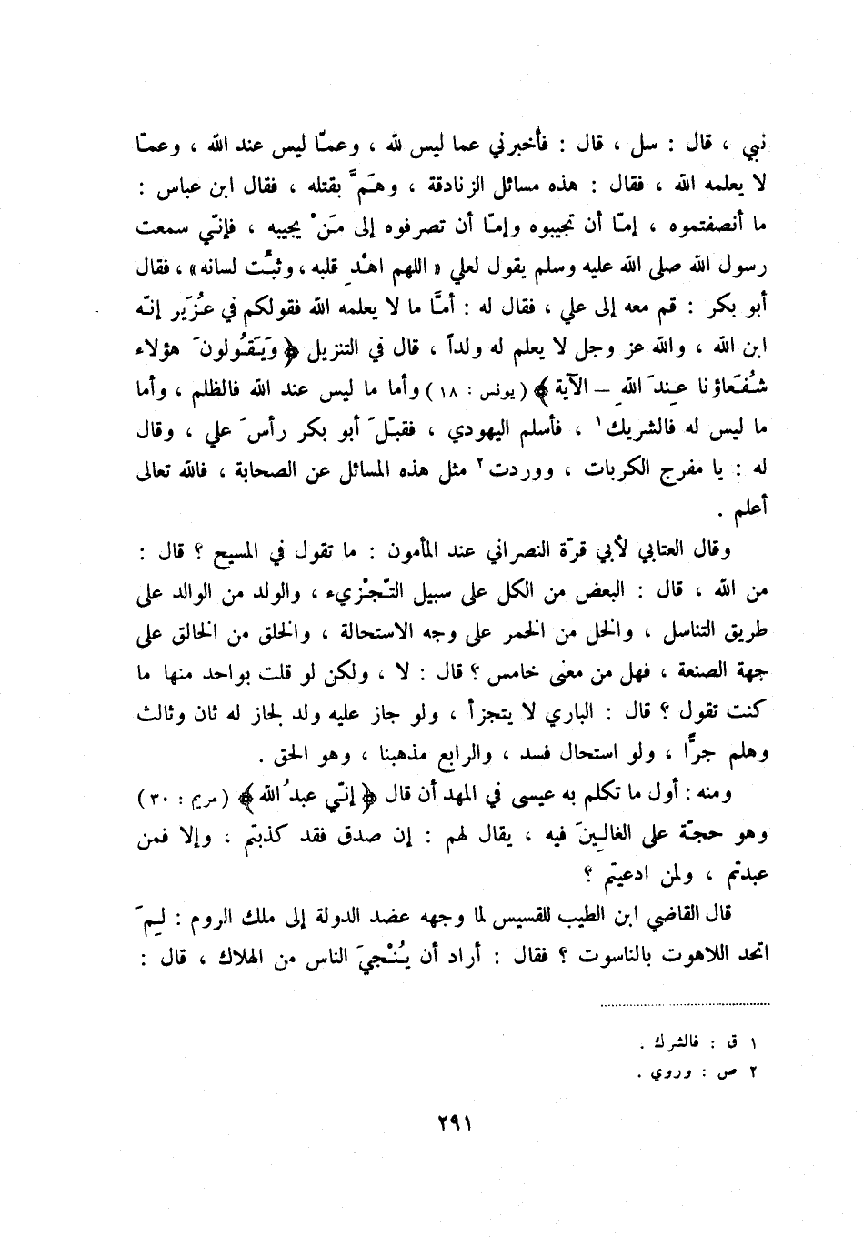 وقال العتابي لأبي قرة النصراني عند المأمون: ما تقول في المسيح قال: من الله، قال: البعض من الكل على سبيل التجزيء، والولد من الوالد على طريق التناسل، والخل من الخمر على وجه الاستحالة، والخلق من الخالق على جهة الصنعة، فهل من معنى خامس قال: لا، ولكن لو قلت بواحد منها ما كنت تقول قال: الباري لا يتجزأ، ولو جاز عليه ولد لجاز له ثان وثالث وهلم جراً، ولو استحال فسد، والرابع مذهبنا، وهو الحق.