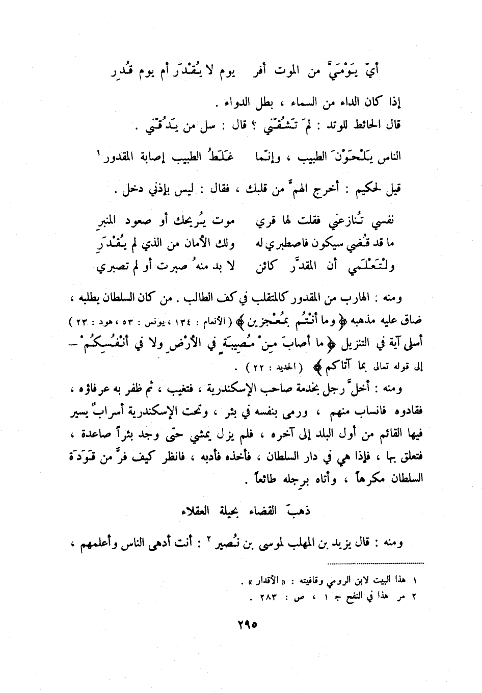 ولتعلمي أن المقدر كائن ... لا بد منه صبرت أو لم تصبري ومنه: الهارب من المقدور كالمتقلب في كف الطالب. من كان السلطان يطلبه، ضاق عليه مذهبه " وما أنتم بمعجزين " أسلى آية في التنزيل " ما أصاب من مصيبة في الأرض ولا في أنفسكم " إلى قوله تعالى " بما آتاكم ".