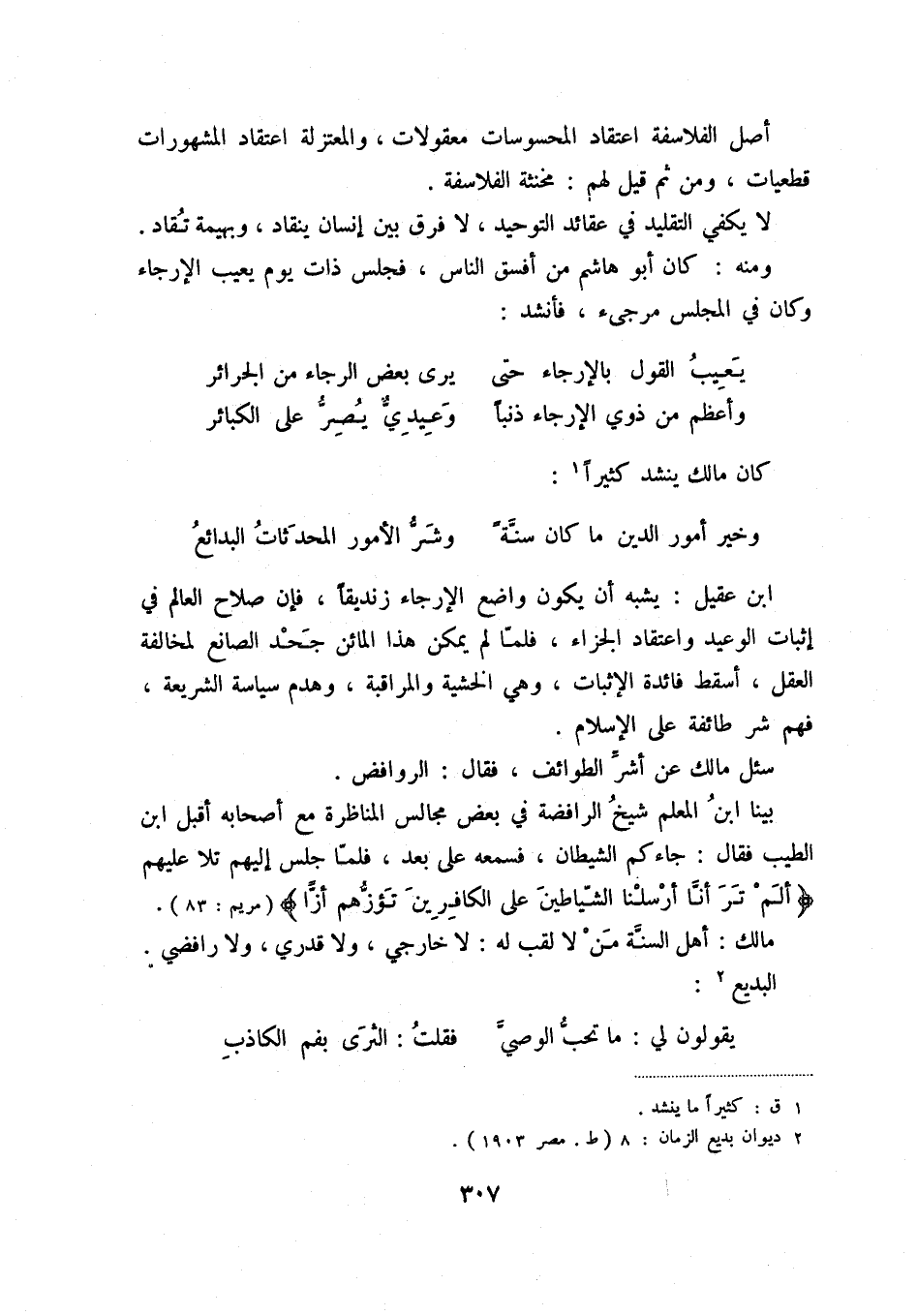 وخير أمور الدين ما كان سنة ... وشر الأمور المحدثات البدائع ابن عقيل: يشبه أن يكون واضع الإرجاء زنديقاً، فإن صلاح العالم في إثبات الوعيد واعتقاد الجزاء، فلما لم يكن هذا المائن جحد الصانع لمخالفة العقل، أسقط فائدة الإثبات، وهي الخشية والمراقبة، وهدم سياسة الشريعة، فهم شر طائفة على الإسلام.