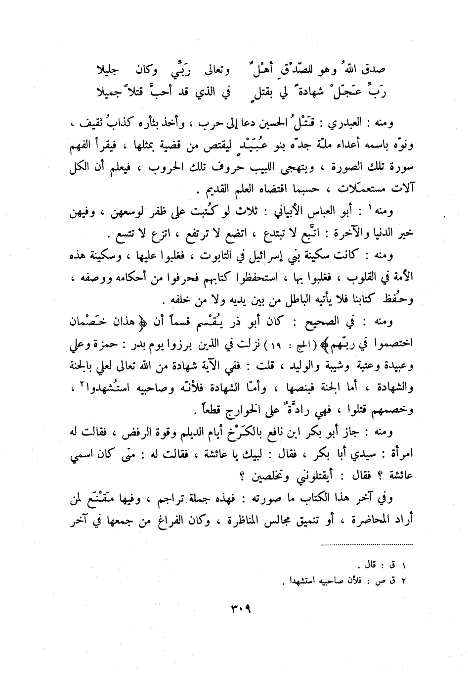 رب عجل شهادة لي بقتل ... في الذي قد أحب قتلاً جميلا ومنه: العبدري: قتل الحسين دعا إلى حرب، وأخذ بثأره كذاب ثقيف، ونوه باسمه أعداء ملة جده بنو عبيد ليقتص من قضية بمثلها، فيقرأ الفهم سورة تلك الصورة، ويتهجى اللبيب حروف تلك الحروب، فيعلم أن الكل آلات مستعملات، حسبما اقتضاه العلم القديم.