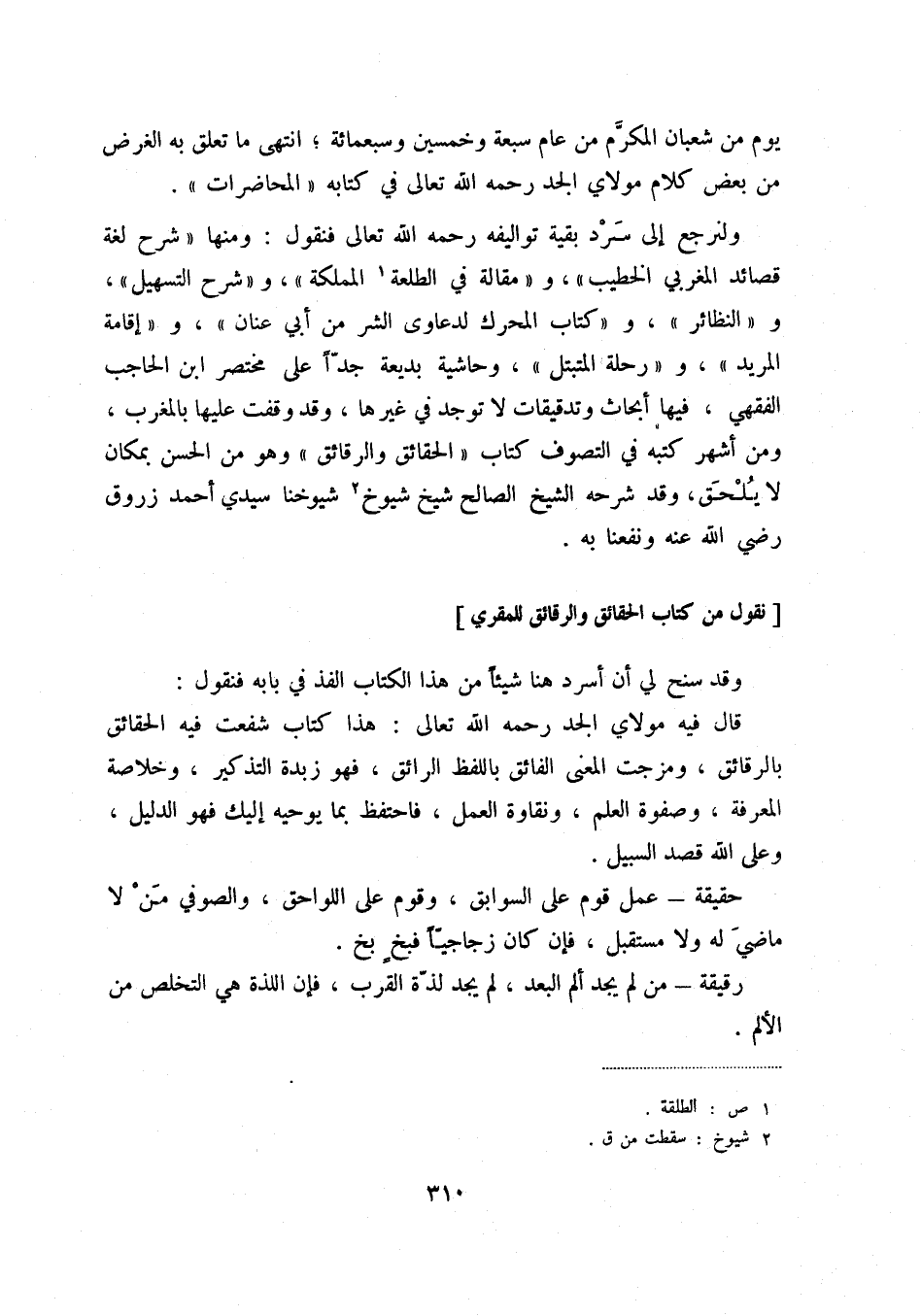 ولنرجع إلى سرد ما بقية تواليفه رحمه الله تعالى فنقول: ومنها " شرح لغة قصائد المغربي الخطيب "، و " مقالة في الطلعة (1) المملكة "، وشرح التسهيل، والنظائر، وكتاب المحرك لدعاوى الشر من أبي عنان، وإقامة المريد، ورحلة المتبتل، وحاشية بديعة جداً على مختصر ابن الحاجب الفقهي، فيها أبحاث وتدقيقات لا توجد في غيرها، وقد وقفت عليها بالمغرب، ومن أشهر كتبه في التصوف كتاب الحقائق والرقائق وهو من الحسن بمكان لا يلحق، وقد شرحه الشيخ الصالح شيخ شيوخ (2) شيوخنا سيدي أحمد زروق رضي الله عنه ونفعنا به.