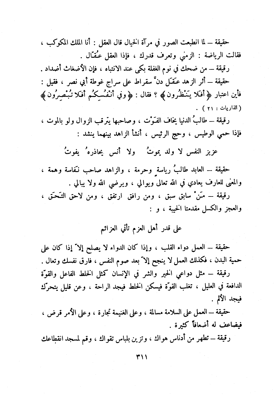 حقيقة - لما انطبعت الصور في مرآة الخيال قال العقل: أنا الملك المكوكب، فقالت الرياضة: الزمني وتعرف قدرك، فإذا العقل عقال.