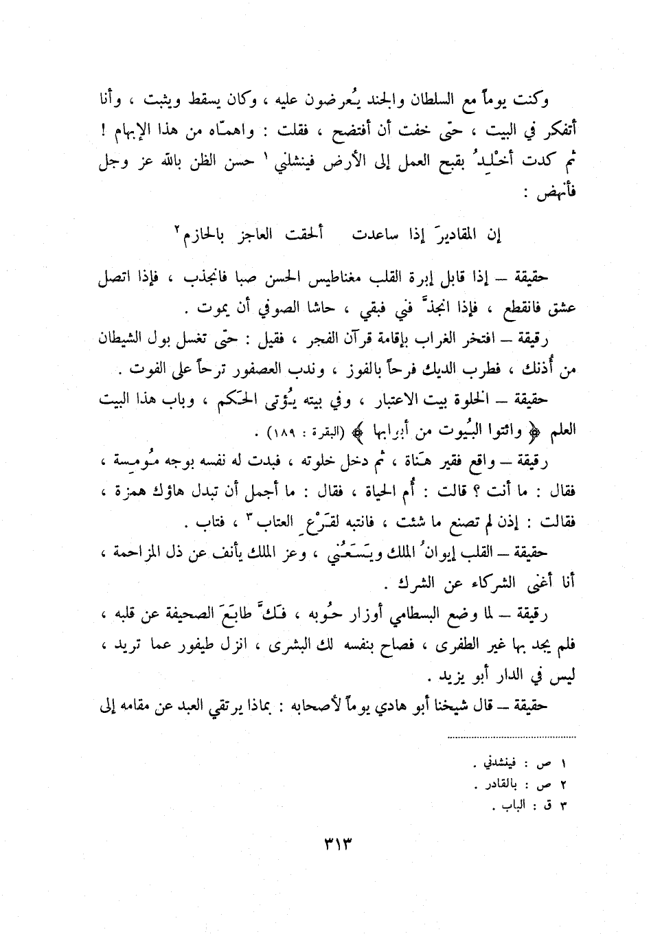 إن المقادير إذا ساعدت ... ألحقت العاجز بالحازم (2) حقيقة - إذا قابل إبرة القلب مغناطيس الحسن صبا فانجذب، فإذا اتصل عشق فانقطع، فإذا انجد فني فبقي، حاشا الصوفي أن يموت.