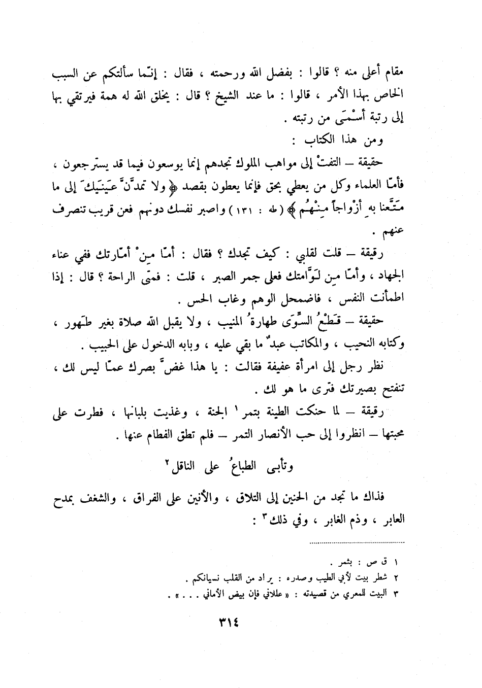 ومن هذا الكتاب: حقيقة: التفت إلى مواهب الملوك تجدهم إنما يوسعون فيما قد يسترجعون، فأما العلماء وكل من يعطي بحق فإنما يعطون بقصد " ولا تمدن عينيك إلى ما متعنا به أزواجاً منهم " واصبر نفسك دونهم فعن قريب تنصرف عنهم.