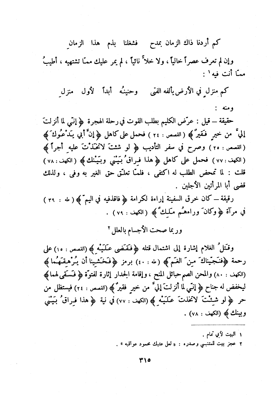 وربما صحت الأجسام بالعلل (2) ... وقتل الغلام إشارة إلى اشتمال قتله " فقضى عليه " على رحمة " فنجيناك من الغم " برمز " فخشينا أن يرهقهما " والمحن الصم حبائل المنح، وإقامة الجدار إثارة لفتوة " فسقى لهما " ليخفض له جناح " إني لما أنزلت إلي من خير فقير " فيستظل من حر " لو شئت لاتخذت عليه " في نية " هذا فراق بيني وبينك "
