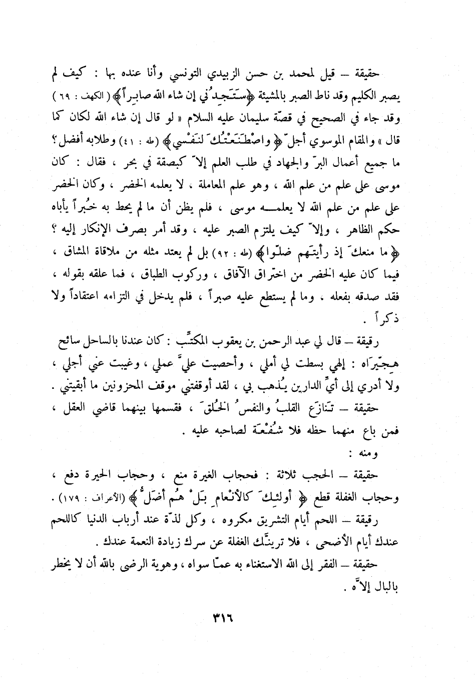 حقيقة: قيل لمحمد بن حسن الزبيدي التونسي وأنا عنده بها: كيف لم يصبر الكليم وقد ناط الصبر بالمشيئة " ستجدني إن شاء الله صابراً " وقد جاء في الصحيح في قصة سليمان عليه السلام " لو قال إن شاء الله لكان كما قال " والمقام الموسوي أجل " واصطنعتك لنفسي " وطلابه أفضل ما جميع أعمال البر والجهاد في طلب العلم إلا كبصقة في بحر، فقال: كان موسى على علم من علم الله، وهو علم المعاملة، لا يعلمه الخضر، وكان الخضر على علم من علم الله لا يعلمه موسى، فلم يظن أن ما لم يحط به خبراً يأباه حكم الظاهر، وإلا كيف يلتزم الصبر عليه، وقد أمر بصرف الإنكار إليه " ما منعك إذ رأيتهم ضلوا " بل لم يعد مثله من ملاقاة المشاق، فيما كان عليه الخضر من اختراق الآفاق، وركوب الطباق، فما عقله بقوله، فقد صدقه بفعله، وما لم يستطع عليه صبراً، فلم يدخل في التزامه اعتقاداً ولا ذكراً.