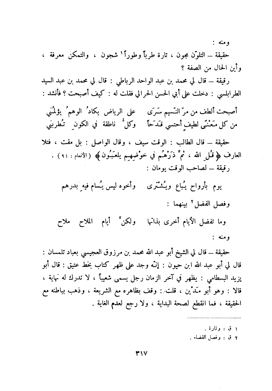 من كل معنى لطيف أحتسي قدحاً ... وكل ناطقة في الكون تطربني حقيقة - قال الطالب: الوقت سيف، وقال الواصل: بل مقت، فتلا العارف {قل الله، ثم ذرهم في خوضهم يلعبون} (الأنعام: 91) .