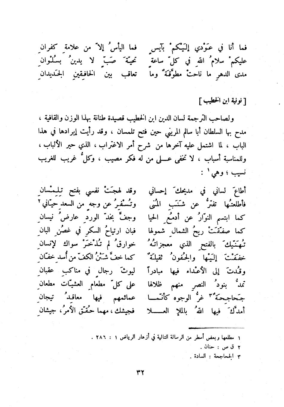 ولصاحب الترجمة لسان الدين ابن الخطيب قصيدة طنانة بهذا الوزن والقافية، مدح بها السلطان أبا سالم المريني حين فتح تلمسان، وقد رأيت إيرادها في هذا الباب، لما اشتمل عليه آخرها من شرح أمر الاغتراب، الذي حير الألباب، وللمناسبة أسباب، لا تخفى على من له فكر مصيب، وكل غريب للغريب نسيب، وهي (1) :