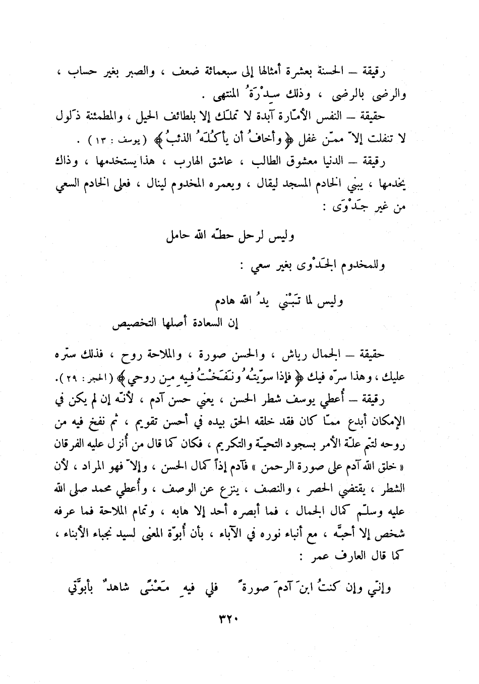 وليس لما تبني يد الله هادم ... إن السعادة أصلها التخصيص حقيقة - الجمال رياش، والحسن صورة، والملاحة روح، فذلك ستره عليك، وهذا سره فيك {فإذا سويته ونفخت فيه من روحي} (الحجر: 29) .
