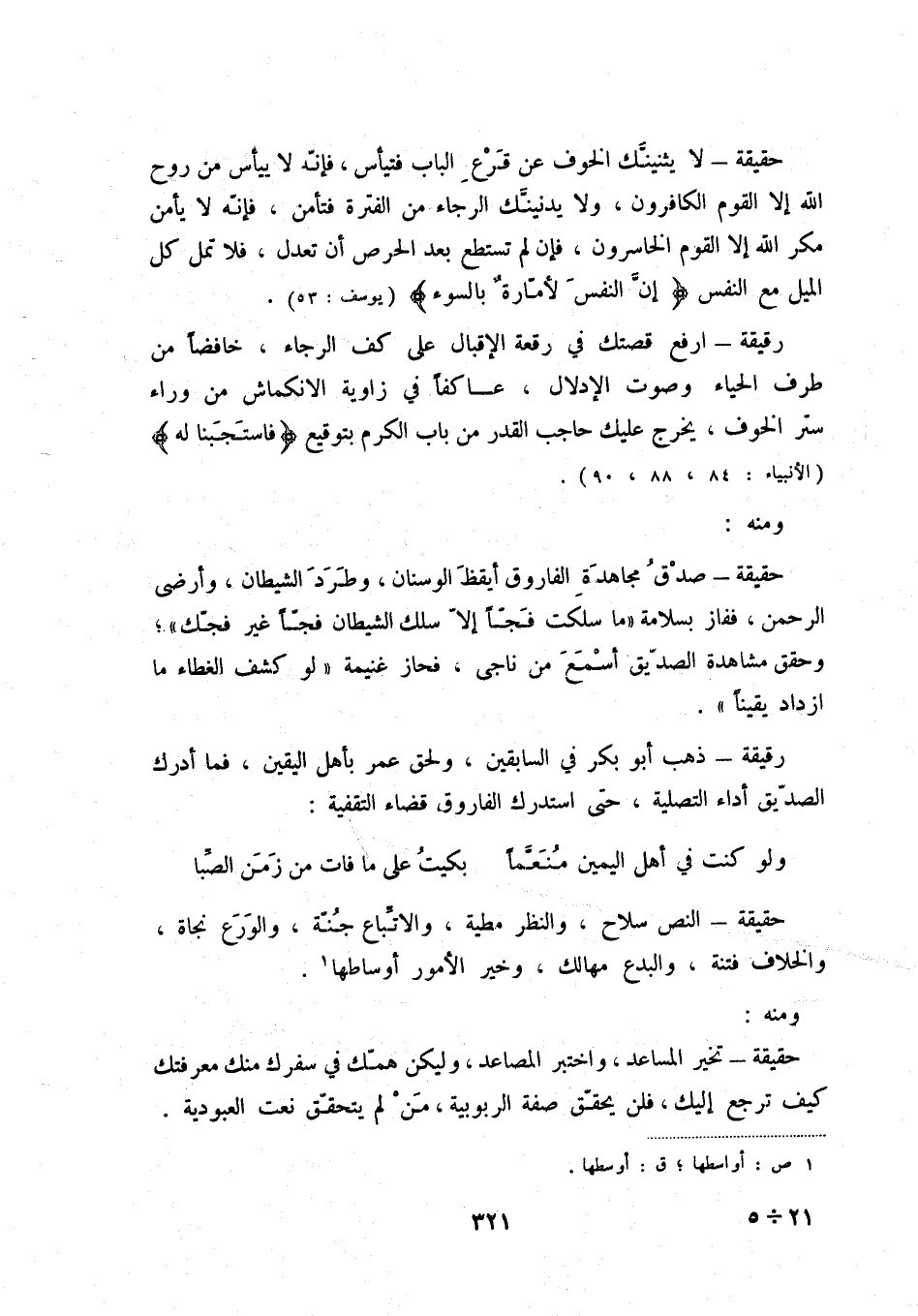 حقيقة - تخير المساعد، واختبر المصاعد، وليكن همك في سفرك منك معرفتك كيف ترجع إليك، فلن يحقق صفة الربوبية، من لم يتحقق نعت العبودية.