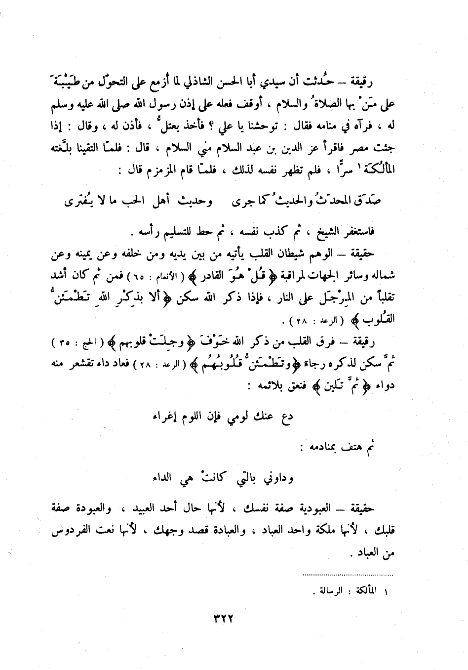 رقيقة - حدثت أن سيدي أبا الحسن الشاذلي لما أزمع على التحول من طيبة على من بها الصلاة والسلام، أوقف فعله على إذن رسول الله صلى الله عليه وسلم له، فرآه في منامه فقال: توحشنا يا علي فأخذ يعتل، فأذن له، وقال: إذا جئت مصر فاقرأ عز الدين بن عبد السلام مني السلام، قال: فلما التقينا بلغته المألكة (1) سراً، فلم تظهر نفسه لذلك، فلما قام المزمزم قال: