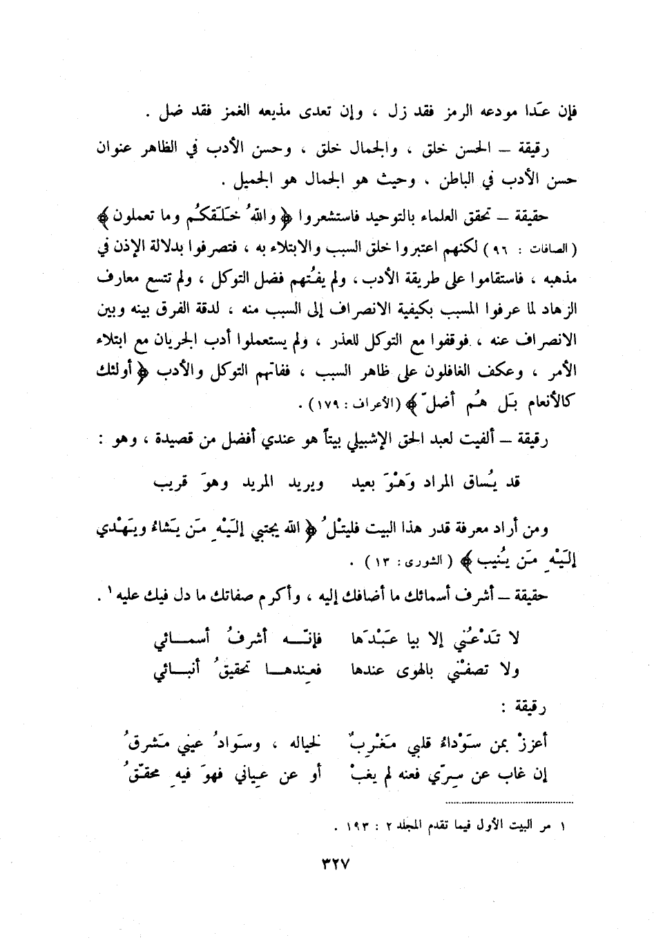 حقيقة - تحقق العلماء بالتوحيد فاستشعروا " والله خلقكم وما تعملون " لكنهم اعتبروا خلق السبب والابتلاء به، فتصرفوا بدلالة الإذن في مذهبه، فاستقاموا على طريقة الأدب، ولم يفتهم فضل التوكل، ولم تتسع معارف الزهاد لما عرفوا المشبب بكيفية الانصراف إلى السبب منه، لدقة الفرق بينه وبين الانصراف عنه، فوقفوا مع التوكل للعذر، ولم يستعملوا أدب الجريان مع ابتلاء الأمر، وعكف الغافلون على ظاهر السبب، ففاتهم التوكل والأدب " أولئك كالأنعام بل هم أضل ".