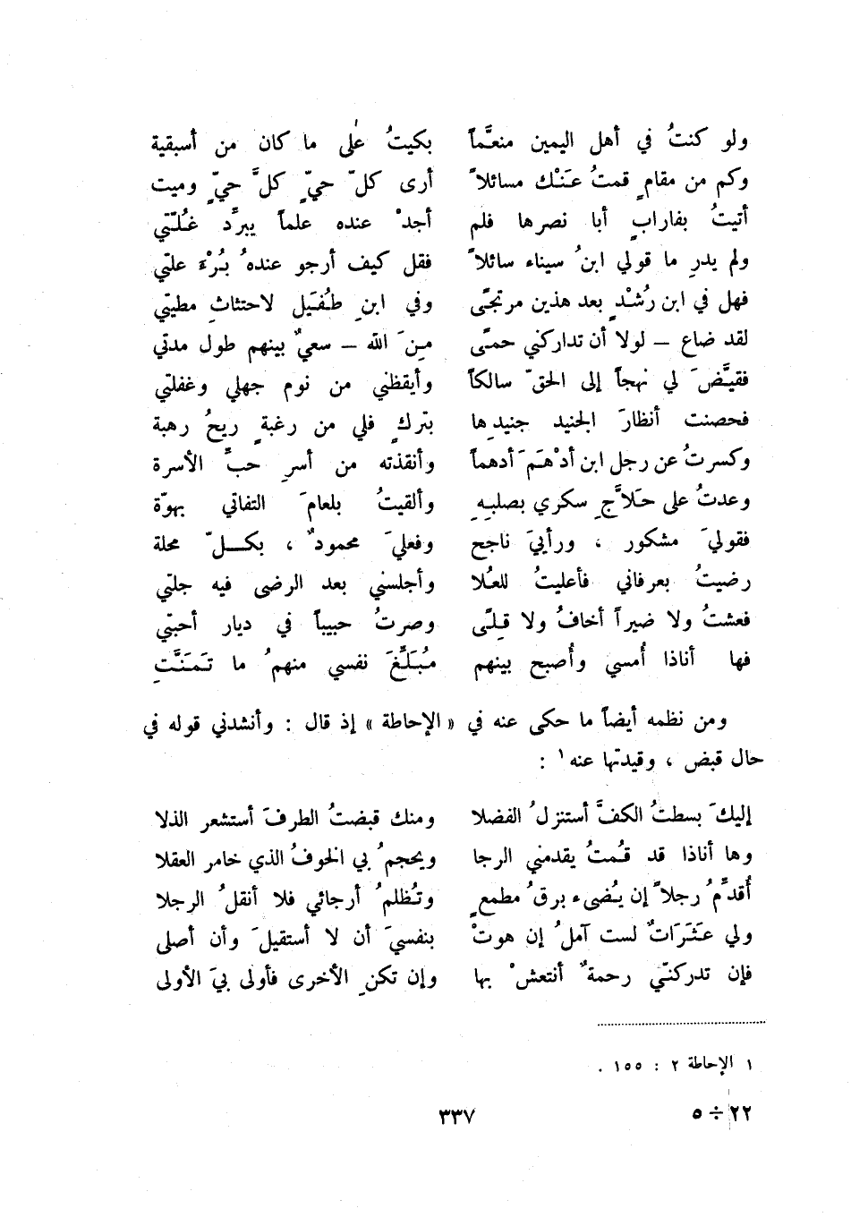 فها أنا ذا أمسي وأصبح بينهم ... مبلغ نفسي منهم ما تمنت ومن نظمه أيضاً ما حكى عنه في الإحاطة إذ قال: وأنشدني قوله في حال قبض، وقيدتها عنه (1) :