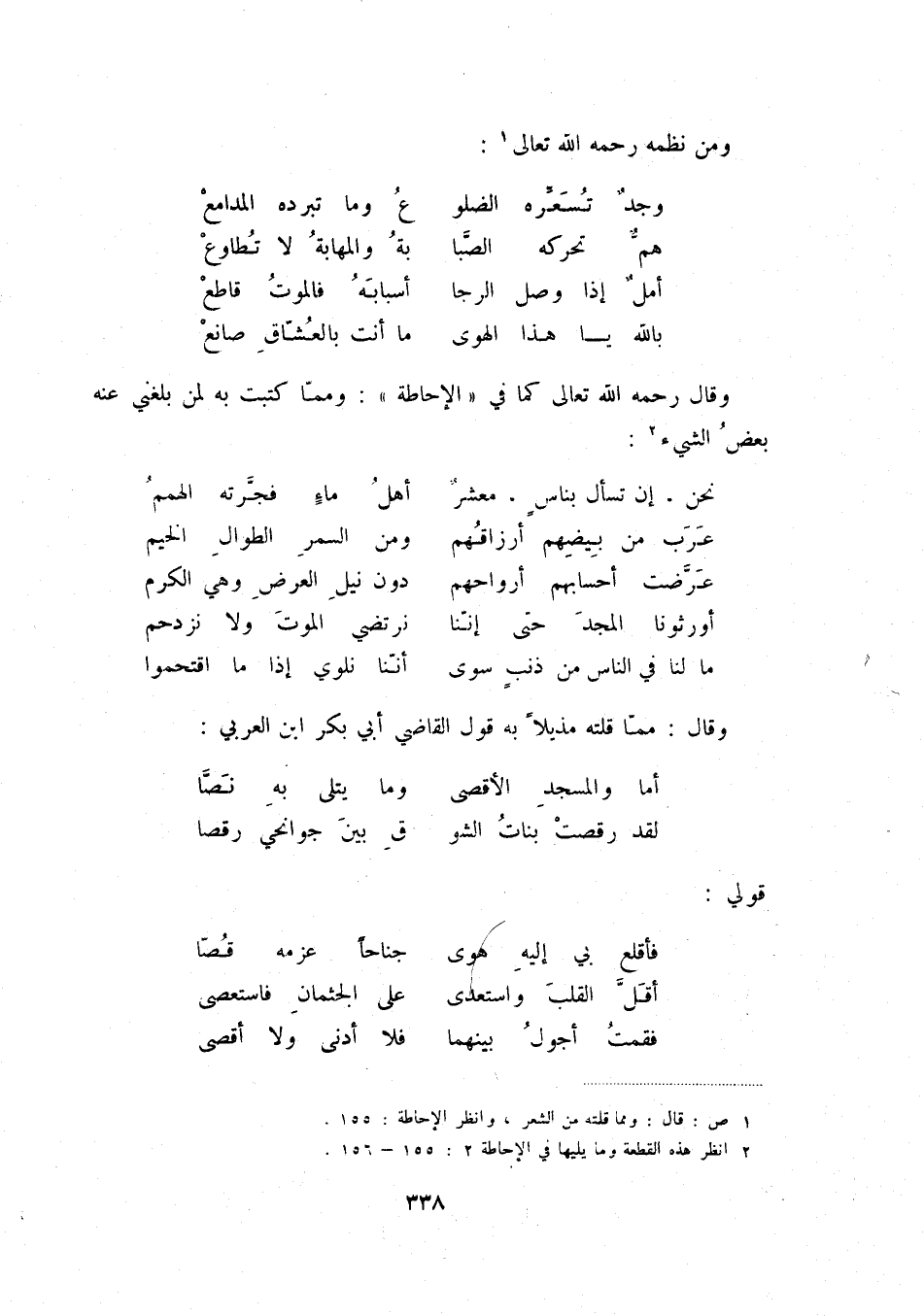 بالله يا هذا الهوى ... ما أنت بالعشاق صانع وقال رحمه الله تعالى كما في " الإحاطة ": ومما كتبت به لمن بلغني عنه بعض الشيء (2) :