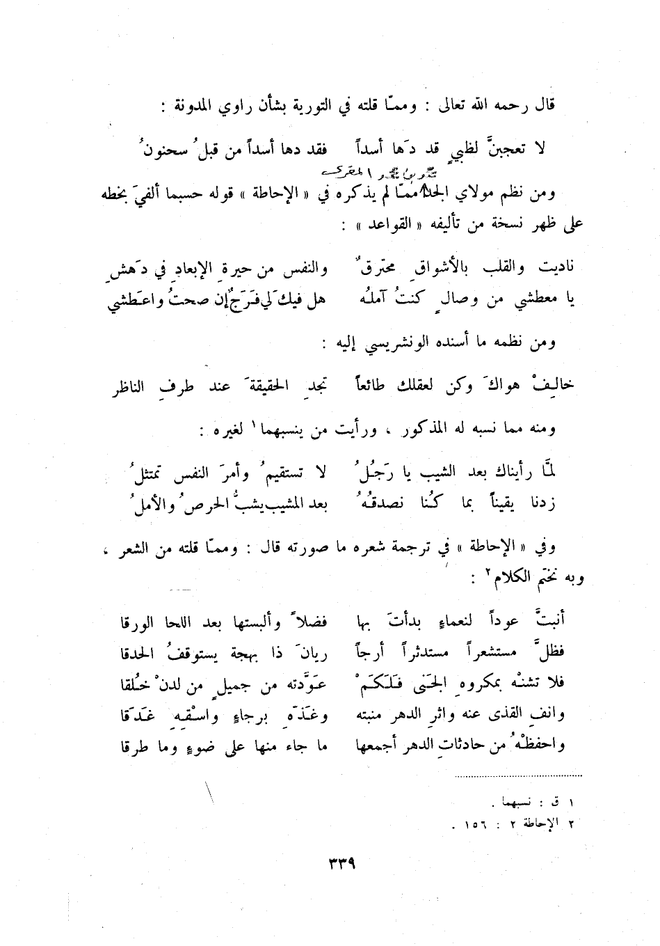 زدنا يقيناً بما كنا نصدقه ... بعد المشيب يشب الحرص والأمل وفي الإحاطة في ترجمة شعره ما صورته قال: ومما قلته من الشعر، وبه نختم الكلام (2) :