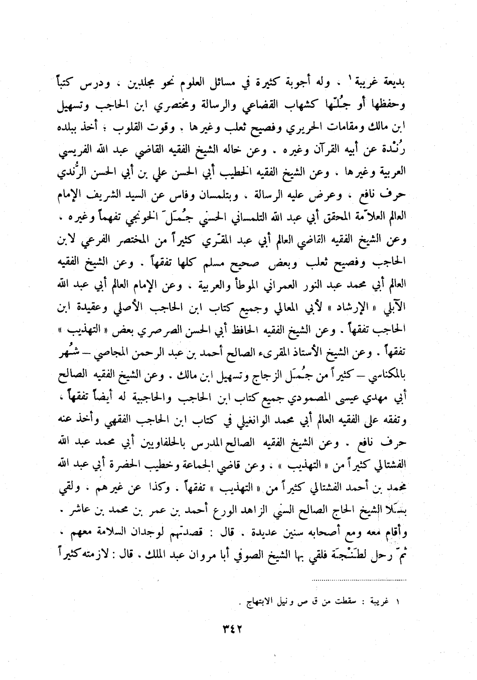 بديعة غريبة (1) ، وله أجوبة كثيرة في مسائل العلوم نحو مجلدين، ودرس كتباً وحفظها أو جلها كشهاب القضاعي والرسالة ومختصري ابن الحاجب وتسهيل ابن مالك ومقامات الحريري وفصيح ثعلب وغيرها، وقوت القلوب؛ أخذ ببلده رندة عن أبيه القرآن وغيره، وعن خاله الشيخ الفقيه القاضي عبد الله الفريسي العربية وغيرها، وعن الشيخ الفقيه الخطيب أبي الحسن علي بن أبي الحسن الرندي حرف نافع، وعرض عليه الرسالة، وبتلمسان وفاس عن السيد الشريف الإمام العالم العلامة المحقق أبي عبد الله التلمساني الحسني جمل الخونجي تفهماً وغيره، وعن الشيخ الفقيه القاضي العالم أبي عبد المقري كثيراً من المختصر الفرعي لابن الحاجب وفصيح ثعلب وبعض صحيح مسلم كلها تفقهاً، وعن الشيخ الفقيه العالم أبي محمد عبد النور العمراني الموطأ والعربية، وعن الإمام العالم أبي عبد الله الآبلي الإرشاد لأبي المعالي وجميع كتاب ابن الحاجب الأصلي وعقيدة ابن الحاجب تفقهاً، وعن الشيخ الفقيه الحافظ أبي الحسن الصرصري بعض التهذيب تفقهاً، وعن الشيخ الأستاذ المقرىء الصالح أحمد بن عبد الرحمن المجاصي شهر بالمكناسي كثيراً من جمل الزجاج وتسهيل ابن مالك، وعن الشيخ الفقيه الصالح أبي مهدي عيسى المصمودي جميع كتاب ابن الحاجب والحاجبية له أيضاً تفقهاً، وتفقه على الفقيه العالم أبي محمد الوانغيلي في كتاب ابن الحاجب الفقهي وأخذ حرف نافع، وعن الشيخ الفقيه الصالح المدرس بالحلفاويين أبي محمد عبد الله الفشتالي كثيراً من التهذيب، وعن قاضي الجماعة وخطيب الحضرة أبي عبد الله محمد بن أحمد الفشتالي كثيراً من التهذيب تفقهاً، وكذا من غيرهم، ولقي بسلا الشيخ الحاج الصالح السني الزاهد الورع أحمد بن عمر بن محمد بن عاشر، وأقام معه ومع أصحابه سنين عديدة، قال: قصدتهم لوجدان السلامة معهم، ثم رحل لطنجة فلقي بها الشيخ الصوفي أبا مروان عبد الملك، قال: لازمته كثيراً