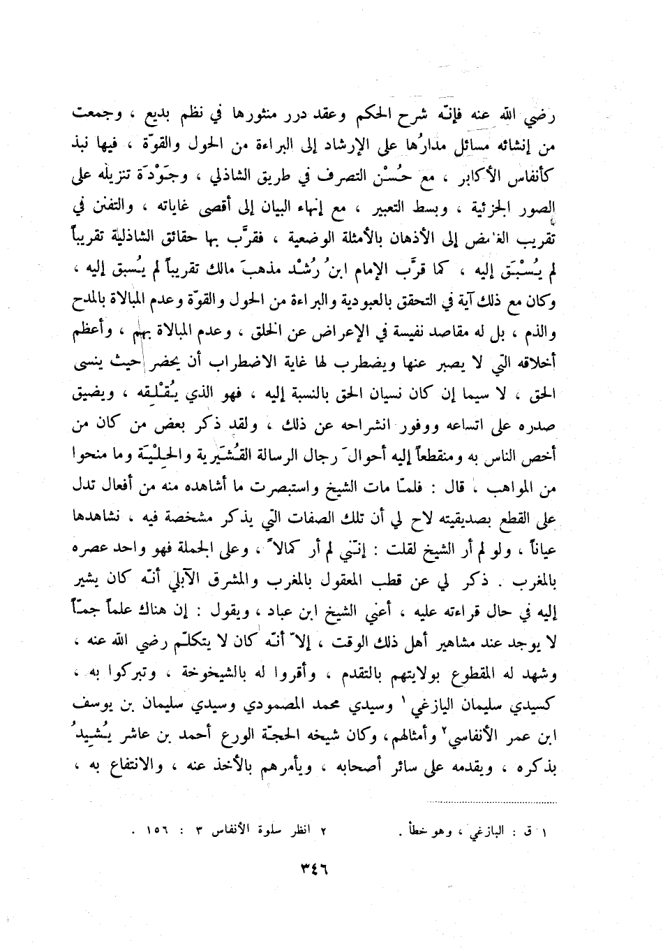 رضي الله عنه فإنه شرح الحكم وعقد درر منثورها في نظم بديع، وجمعت من إنشائه مسائل مدارها على الإرشاد إلى البراءة من الحول والقوة، فيها نبذ كأنفاس الأكابر، مع حسن التصرف في طريق الشاذلي، وجودة تنزيله على الصور الجزئية، وبسط التعبير، مع إنهاء البيان إلى أقصى غاياته، والتفنن في تقريب الغامض إلى الأذهان بالأمثلة الوضعية، فقرب بها حقائق الشاذلية تقريباً لم يسبق إليه، كما قرب الإمام ابن رشد مذهب مالك تقريباً لم يسبق إليه، وكان مع ذلك آية في التحقق بالعبودية والبراءة من الحول والقوة وعدم المبالاة بالمدح والذم، بل له مقاصد نفيسة في الإعراض عن الخلق، وعدم المبالاة بهم، وأعظم أخلاقه التي لا يصبر عنها ويضطرب لها غاية الاضطراب أن يحضر حيث ينسى الحق، لا سيما إن كان نسيان الحق بالنسبة إليه، فهو الذي يقلقه، ويضيق صدره على اتساعه ووفور انشراحه عن ذلك، ولقد ذكر بعض من كان من أخص الناس به ومنقطعاً إليه أحوال رجال الرسالة القشيرية والحلية وما منحوا من المواهب، قال: فلما مات الشيخ واستبصرت ما أشاهده منه من أفعال تدل على القطع بصديقيته لاح لي أن لتك الصفات التي يذكر مشخصة فيه، نشاهدها عياناً، ولو لم أر الشيخ لقلت: إنني لم أر كمالاً، وعلى الجملة فهو واحد عصره بالمغرب، ذكر لي عن قطب المعقول بالمغرب والمشرق الآبلي أنه كان يشير إليه في حال قراءته عليه، أعني الشيخ ابن عباد، ويقول: إن هناك علماً جماً لا يوجد عند مشاهير أهل ذلك الوقت، إلا أنه كان لا يتكلم رضي الله عنه، وشهد له المقطوع بولايتهم بالتقدم، وأقروا له بالشيخوخة، وتبركوا به، كسيدي سليمان اليازغي (1) وسيدي محمد المصمودي وسيدي سليمان ابن يوسف ابن عمر الأنفاسي (2) وأمثالهم، وكان شيخه الحجة الورع أحمد ابن عاشر يشيد بذكره، ويقدمه على سائر أصحابه، ويأمرهم بالأخذ عنه، والانتفاع به،