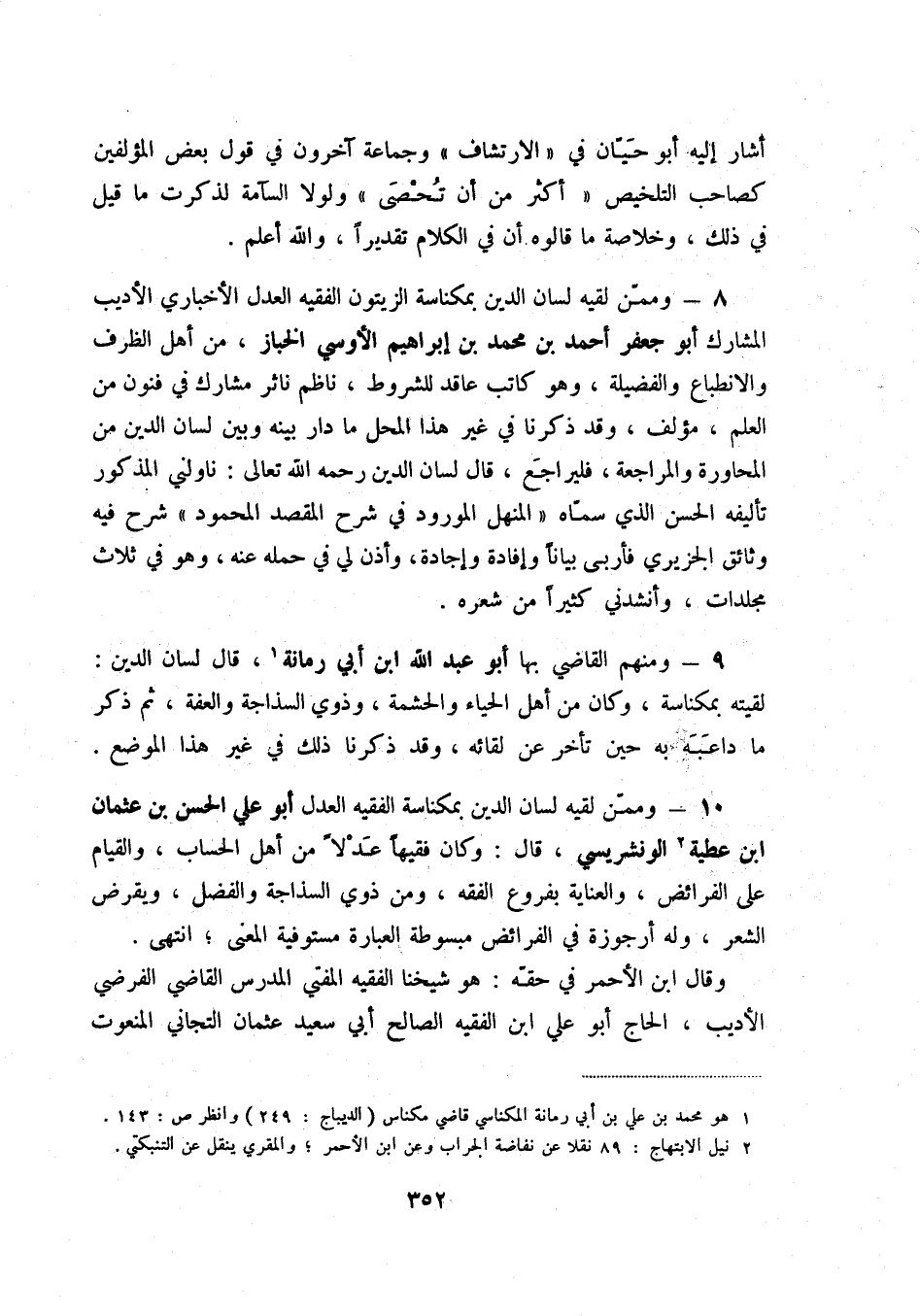 8 - وممن لقيه لسان الدين بمكناسة الزيتون الفقيه العدل الأخباري الأديب المشارك أبو جعفر أحمد بن محمد بن إبراهيم الأوسي الخباز، من أهل الظرف والانطباع والفضيلة، وهو كاتب عاقد للشروط، ناظم ناثر مشارك في فنون من العلم، مؤلف، وقد ذكرنا في غير هذا المحل ما دار بينه وبين لسان الدين من المحاورة والمراجعة، فليراجع، قال لسان الدين رحمه الله تعالى: ناولني المذكور تأليفه الحسن الذي سماه المنهل المورود في شرح المقصد المحمود شرح فيه وثائق الجزيري فأربى بياناً وإفادة وإجادة، وأذن لي في حمله عنه، وهو في ثلاث مجلدات، وأنشدني كثيراً من شعره.