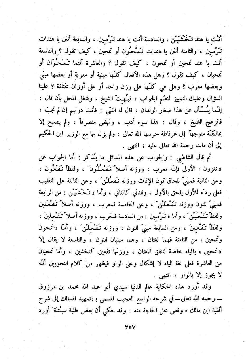 ثم قال الشاطبي: والجواب عن هذه المسائل ما يذكر: أما الجواب عن تغزون الأولى فإنه معرب، ووزنه أصلاً تفعلون، ولفظاً تفعون، وعن الثانية فبني للحاق نون الإناث ووزنه تفعلن، وعن الثالثة على التغليب فعلى رده بالأول يلحق بالأول، وللثاني كالثاني، وأما تخشين من الرابعة فمبني للنون ووزنه تفعلن، وعن الخامسة فمعرب، ووزنه أصلاً تفعلين ولفظاً تفعين، وأما ترمين من السادسة فمعرب، ووزنه أصلاً تفعلين، ولفظاً تفعين، ومن السابعة مبني للنون، ووزنه تفعلن، وأما تمحون وتمحين من الثامنة فهما لغتان، وهما مبنيان للنون، والتاسعة لا يقال إلا تمحين، بالياء خاصة لتتفق اللغتان، ووزنهما تفعين كتخشين، وأما تمحيان من العاشرة فعلى لغة الياء لا إشكال وعلى الواو فيظهر من كلام النحويين أنه لا يجوز إلا بالواو؛ انتهى.
