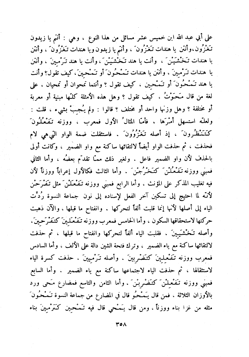 على أبي عبد الله ابن خميس عشر مسائل من هذا النوع، وهي: أنتم يا زيدون تغزون، وأنتن يا هندات تغزون، وأنتم يا زيدون ويا هندات تغزون، وأنتن يا هندات تخشين، وأنت يا هند تخشين، وأنت يا هند ترمين وأنتن يا هندات ترمين، وأنتن يا هندات تمحون أو تمحين، كيف تقول وأنت يا هند تمحون أو تمحين، كيف تقول وأنتما تمحوان أو تمحيان، على لغة من قال محوت، كيف تقول وهل هذه الأمثلة كلها مبنية أو معربة أو مختلفة وهل وزنها واحد أو مختلف قالوا: ولم يجب بشيء، قلت ولعله استسهل أمرها، فأما المثال الأول فمعرب، وزنه تفعلون كتنظرون، إذ أصله تغزوون، فاستثقلت ضمة الواو التي هي لا فحذفت، ثم حذفت الواو أيضاً لالتقائها ساكنة مع واو الضمير، وكانت أولى بالحذف لأن واو الضمير فاعل، ولغير ذلك مما تقدم بعضه، وأما الثاني فمبني ووزنه تفعلن كتخرجن، وأما الثالث فكالأول إعراباً ووزناً لأن فيه تغليب المذكر على المؤنث، وأما الرابع فمبني ووزنه تفعلن، مثل تفرحن لأنه لما احتيج إلى تسكين آخر الفعل لإسناده إلى نون جماعة النسوة ردت الياء إلى أصلها لأنها إنما قلبت ألفاً لتحريكها، وانفتاح ما قبلها، والآن ذهبت حركتها لاستحقاقها السكون، وأما الخامس فمعرب ووزنه تفعلين كتفرحين، وأصله تخشيين، فقلبت الياء ألفاً لتحركها وانفتاح ما قبلها، ثم حذفت لالتقائها ساكنة مع ياء الضمير، وترك فتحة الشين دالة على الألف، وأما السادي فمعرب ووزنه تفعلين كتضربين، وأصله ترميين، حذفت كسرة الياء لاستثقالها، ثم حذفت الياء لاجتماعها ساكنة مع ياء الضمير، وأما السابع فمبني ووزنه تفعلن كتضربن، وأما الثامن والتاسع فمضارع محى ورد بالأوزان الثلاثة، فمن قال يمحو قال في المضارع من جماعة النسوة تمحون مثله من غزا بناء ووزناً، ومن قال يمحي قال فيه تمحين كترمين بناء