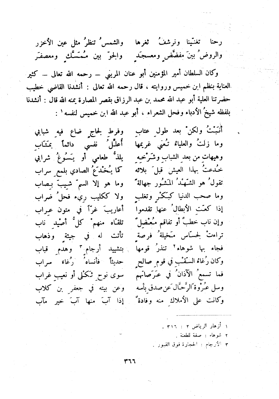 والروض بين مفضض ومعسجد ... والجو بين ممسك ومعصفر وكان السلطان أمير المؤمنين أبو عنان المريني - رحمه الله تعالى - كثير العناية بنظم ابن خميس وروايته، قال رحمه الله تعالى: أنشدنا القاضي خطيب حضرتنا العلية أبو عبد الله محمد بن عبد الرزاق بقصر المصارة يمنه الله قال: أنشدنا بلفظه شيخ الأدباء وفحل الشعراء، أبو عبد الله ابن خميس لنفسه (1) :