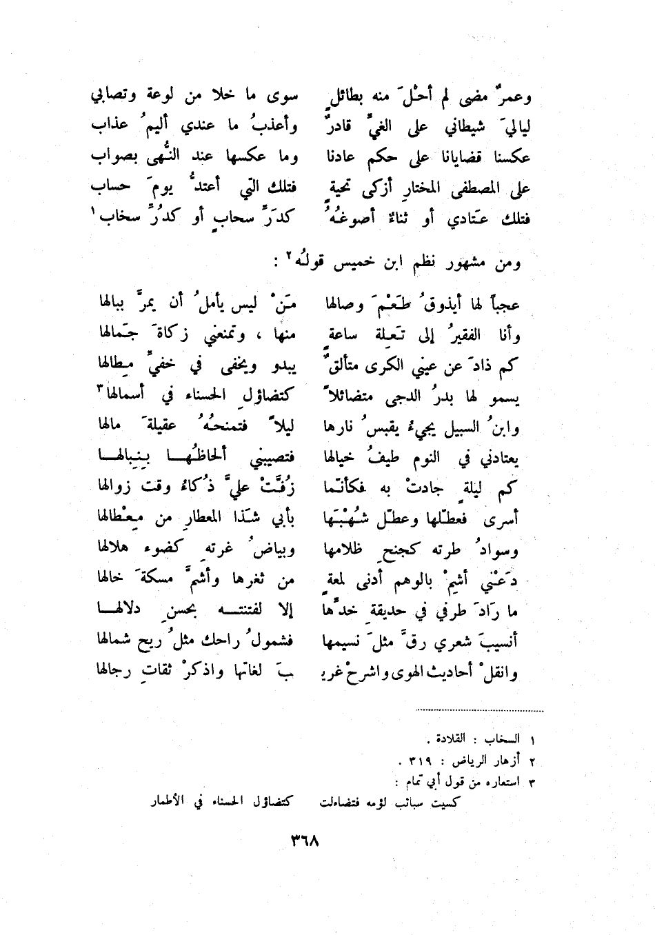 فتلك عتادي أو ثناء أصوغه ... كدر سحاب أو كدر سخاب (1) ومن مشهور نظم ابن خميس قوله (2) :
