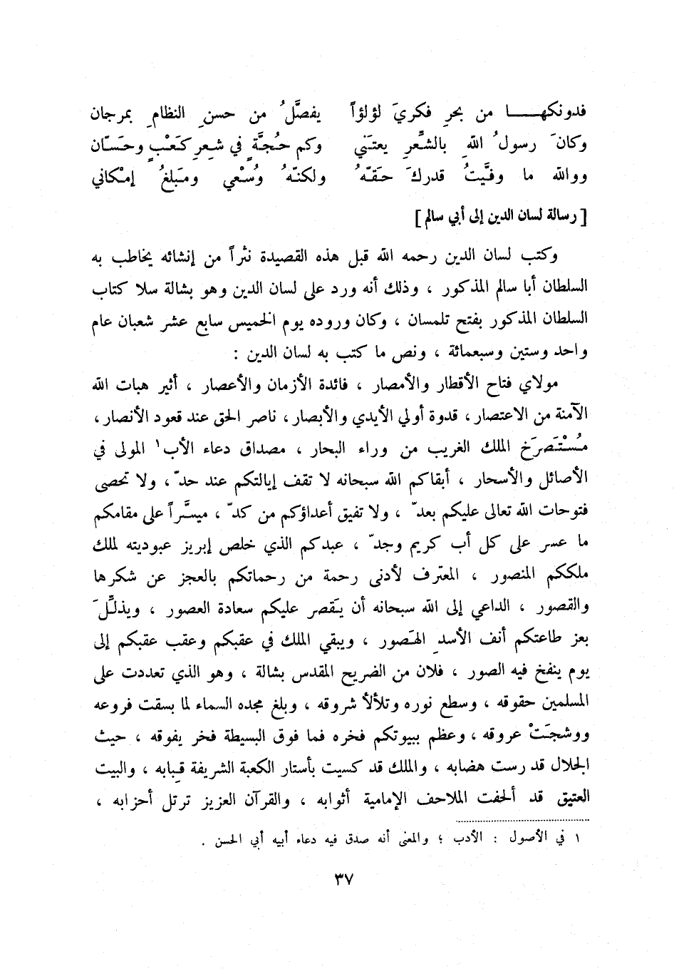 وكتب لسان الدين رحمه الله قبل هذه القصيدة نثرا ًمن إنشائه يخاطب به السلطان أبا سالم المذكور، وذلك أنه ورد على لسان الدين وهو بشالة سلا كتاب السلطان المذكور بفتح تلمسان، وكان وروده يوم الخميس سابع عشر شعبان عام واحد وستين وسبعمائة، ونص ما كتب به لسان الدين: