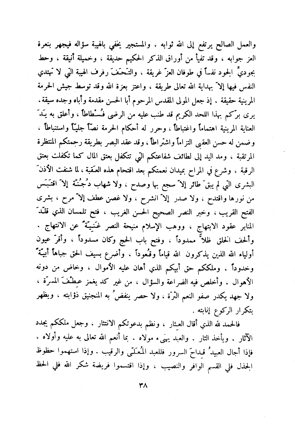 والعمل الصالح يرتفع إلى الله ثوابه، والمستجير يخفي بالهيبة سؤاله فيجهر بنعرة العز جوابه، وقد تفيأ من أوراق الذكر الحكيم حديقة، وخميلة أنيقة، وحط بجودي الجود نفساً في طوفان العز غريقة، والتحف رفرف الهيبة التي لا تهتدي النفس فيها إلا بهداية الله تعالى طريقة، واعتز بعزة الله وقد توسط جيش الحرمة المرينية حقيقة، إذ جعل المولى المقدس المرحوم أبا الحسن مقدمة وأباه وجده سيقة، يرى بركم بهذا اللحد الكريم قد طنب عليه من الرضى فسطاطاً، وأعلق به يد العناية المرينية اهتماماً واغتباطاً، وحرر له أحكام الحرمة نصاً جلياً واستنباطاً، وضمن له حسن العقبى التزاماً واشتراطاً، وقد عقد البصر بطريقة رحمتكم المنتظرة المرتقبة، ومد اليد إلى لطائف شفاعتكم التي تتكفل بعتق المال كما تكفلت بعتق الرقبة، وشرع في المراح بميدان نعمتكم بعد اقتحام هذه العقبة، لما شنفت الأذن البشرى التي لم يبق طائر إلا سجع بها وصدح، ولا شهاب دجنة إلا اقتبس من نورها واقتدح، ولا صدر إلا انشرح، ولا غصن عطف إلا مرح، بشرى الفتح القريب، وخبر النصر الصحيح الحسن الغريب، فتح تلمسان الذي قلد المنابر عقود الابتهاج، ووهب الإسلام منيحة النصر غنية عن الانتهاج، وألحف الخلق ظلاً ممدوداً، وفتح باب الحج وكان مسدوداً، وأقر عيون أولياء الله الذين يذكرون الله قياماً وقعوداً، وأضرع بسيف الحق جباهاً أبية وخدوداً، وملككم حق أبيكم الذي أهان عليه الأموال، وخاض من دونه الأهوال، وأخلص فيه الضراعة والسؤال، من غير كد يغمز عطف المسرة، ولا جهد يكدر صفو النعم الثرة، ولا حصر ينفض به المنجنيق ذؤابته، ويظهر بتكرار الركوع إنابته.