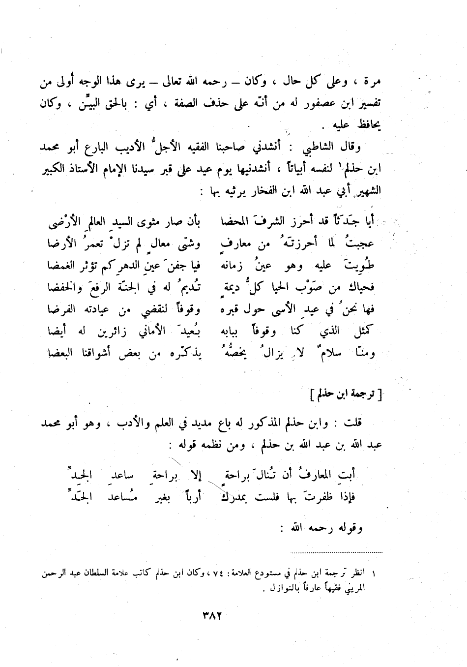 قلت: وابن حذلم المذكور له باع مديد في العلم والأدب، وهو أبو محمد عبد الله بن عبد الله بن حذلم، ومن نظمه قوله: