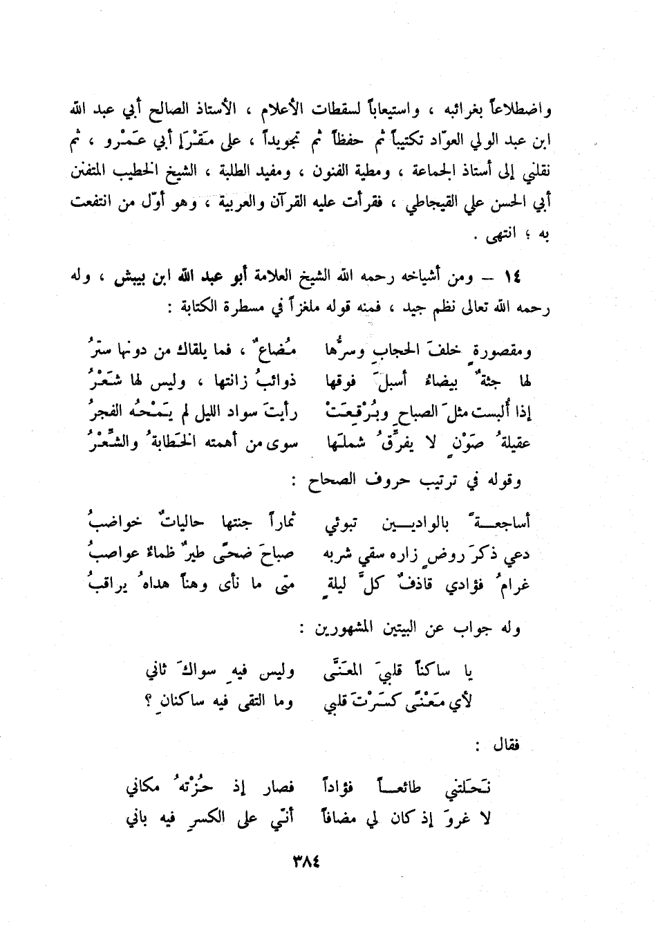 14 - ومن أشياخه رحمه الله الشيخ العلامة أبو عبد الله ابن بيبش، وله رحمه الله تعالى نظم جيد، فمنه قوله ملغزاً في مسطرة الكتابة:
