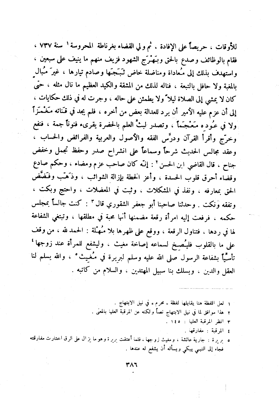 للأوقات، حريصاً على الإفادة، ثم ولي القضاء بغرناطة المحروسة (1) سنة 737، فقام بالوظائف وصدع بالحق وبهرج الشهود فزيف منهم ما يزيد على سبعين، واستهدف بذلك إلى معاداة ومناضلة خاض ثبجها وصادم تياره، غير مبال بالمغبة ولا حافل بالتبعة، فناله لذلك من المشقة والكيد العظيم ما نال مثله، حتى كان لا يمشي إلى الصلاة ليلاً ولا يطمئن على حاله، وجرت له في ذلك حكايات، إلى أن عزم عليه الأمير أن يرد للعدالة بعض من أخره، فلم يجد في قناته مغمزاً ولا في عوده معجماً، وتصدر لبث العلم بالحضرة، يقرئ فنوناً جمة، فنفع وخرج وأقرأ القرآن ودرس الفقه والأصول والعربية والفرائض والحساب، وعقد مجالس الحديث شرحاً وسماعاً على انشراح صدره وحفظ تجمل وخفض جناح، قال القاضي ابن الحسن (2) : إنه كان صاحب عزم ومضاء، وحكم صادع وقضاء أحرق قلوب الحسدة، وأعز الخطة بإزالة الشوائب، وذهب وفضض الحق بمعارفه، ونذف في المشكلات، وثبت في المعضلات، واحتج وبكت، وتفقه ونكت. وحدثنا صاحبنا أبو جعفر الشقوري قال (3) : كنت جالساً بمجلس حكمه، فرفعت رقعة مضمنها أنها محبة في مطلقها، وتبتغي الشفاعة لها في ردها، فتناول الرقعة، ووقع على ظهرها بلا مهلة: الحمد لله، من وقف على ما بالقلوب فليصخ لسماعه إصاخة معيث، وليشفع للمرأة عند زوجها (4) تأسياً بشفاعة الرسول صلى الله عليه وسلم لبريرة في مغيث (5) ، والله يسلم لنا العقل والدي، ويسلك بنا سبيل المهتدين، والسلام من كاتبه.
