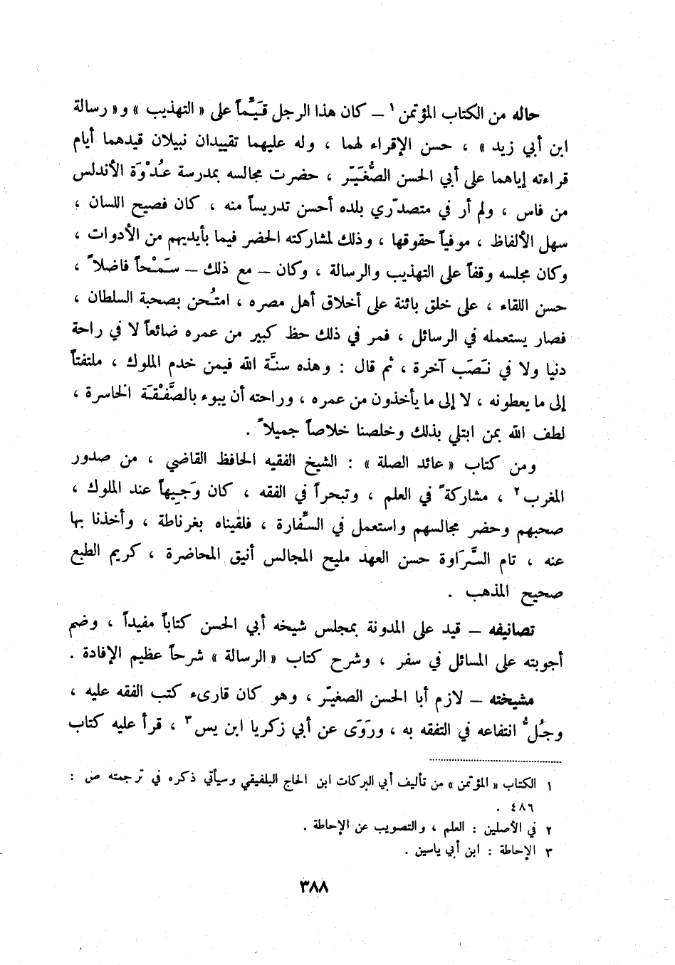 حاله من الكتاب المؤتمن (1) - كان هذا الرجل قيماً على التهذيب ورسالة ابن أبي زيد، حسن الإقراء لهما، وله عليهما تقييدان نبيلان قيدهما أيام قراءته إياهما على أبي الحسن الصغير، حضرت مجالسه بمدرسة عدوة الأندلس من فاس، ولم أر في متصدري بلده أحسن تدريساً منه، كان فصيح اللسان، سهل الألفاظ، موفياً حقوقها، وذلك لمشاركته الحضر فيما بأيديهم من الأدوات، وكان مجلسه وقفاً على التهذيب والرسالة، وكان مع ذلك سمحاً فاضلاً، حسن اللقاء، على خلق بائنة على أخلاق أهل مصره، امتحن بصحبة السلطان، فصار يستعمله في الرسائل، فمر في ذلك حظ كبير من عمره ضائعاً لا في راحة دنيا ولا في نصب آخرة، ثم قال: وهذه سنة الله فيمن خدم الملوك، ملتفتاً إلى ما يعطونه، لا إلى ما يأخذون من عمره، وراحته أن يبوء بالصفقة الخاسرة، لطف الله بمن ابتلي بذلك وخلصنا خلاصاً جميلاً.