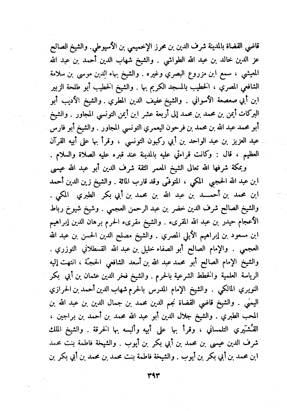 وبمكة شرفها الله تعالى الشيخ المعمر الثقة شرف الدين أبو عبد الله عيسى بن عبد الله الحجبي المكي، المتوفى وقد قارب المائة، والشيخ زين الدين أحمد بن محمد بن أحمد بن عبد الله بن محمد بن أبي بكر الطبري المكي. والشيخ الصالح شرف الدين خضر بن عبد الرحمن العجمي، وشيخ شيوخ رباط الأعجام حيدر بن عبد الله المقرئ. والشيخ مقرئ الحرم برهان الدين إبراهيم بن مسعود الأيلي المصري. والشيخ مصلح الدين الحسن بن عبد الله العجمي. والشيخ مصلح الدين الحسن بن عبد الله العجمي. والإمام الصالح أبو الصفاء خليل بن عبد الله القسطلاني التوزري. والشيخ الإمام الصالح أبو محمد عبد الله بن أسعد الشافعي الحجة، انتهت إليه الرياسة العلمية والخطط الشرعية بالحرم. والشيخ فخر الدين عثمان بن أبي بكر النويري المالكي. والشيخ الإمام المدرس بالحرم شهاب الدين أحمد بن الحرازي اليمني. والشيخ قاضي القضاة نجم الدين محمد بن جمال الدين بن عبد الله بن المحب الطبري، والشيخ جلال الدين أبو عبد الله محمد بن أحمد بن براجين، القشيري التلمساني، وقرأ بها على أبيه وألبسه بها الخرقة، والشيخ الملك شرف الدين عيسى بن محمد بن أبي بكر بن أيوب، والشيخة فاطمة بنت محمد ابن محمد بن أبي بكر بن أيوب، والشيخة فاطمة بني محمد بن محمد بن أبي بكر بن