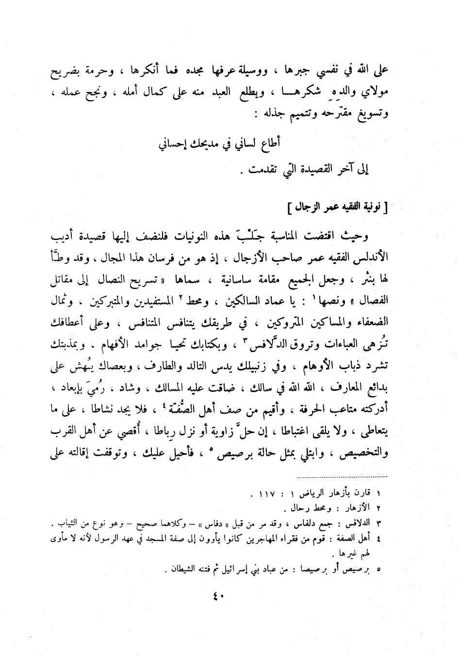 وحيث اقتضت المناسبة جلب هذه النونيات فلنضف إليها قصيدة أديب الأندلس الفقيه عمر صاحب الأزجال، إذ هو من فرسان هذا المجال، وقد وطأ لها بنثر، وجعل الجميع مقامة ساسانية، سماها " تسريح النصال إلى مقاتل الفصال " ونصها (1) : يا عماد السالكين، ومحط (2) المستفيدين والمتبركين، وثمال الضعفاء والمساكين المتروكين، في طريقك يتنافس المتنافس، وعلى أعطافك تزهى العباءات وتروق الدلافس (3) ، وبكتابك تحيا جوامد الأفهام، وبمذبتك تشرد ذباب الأوهام، وفي زنبيلك يسد التالد والطارف، وبعصاك يهش على بدائع المعارف، الله الله في سالك، ضاقت عليه المسالك، وشاد، رمي بإبعاد، أدركته متاعب الحرفة، وأقيم من صف أهل الصفة (4) ، فلا يجد نشاطا، على ما يتعاطى، ولا يلقى اغتباطا، إن حل زاوية أو نزل رباطا، أقصي عن أهل القرب والتخصيص، وابتلي بمثل حالة برصيص (5) ، فأحيل عليك، وتوقفت إقالته على