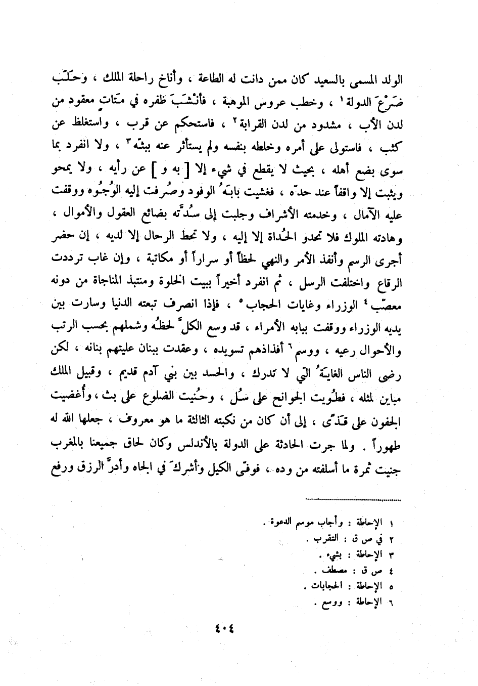 الولد المسمى بالسعيد كان ممن دانت له الطاعة، وأناخ راحلة الملك، وحلب ضرع الدولة (1) ، وخطب عروس الموهبة، فأنسب ظفره في متات معقود من لدن الأب، مشدود من لدن القرابة (2) ، فاستحكم عن قرب، واستغلظ عن كثب، فاستولى على أمره وخلقه بنفسه ولم يستأثر عنه ببثه (3) ، ولا انفرد بما سوى بضع أهله، بحيث لا يقطع في شيء إلا [به و] عن رأيه، ولا يمحو ويثبت إلا واقفاً عند حده، فغشيت بابه الوفود وصرفت إليه الوجوه ووقفت عليه الآمال، وخدمته الأشراف وجلبت إلى سدته بضائع العقول والأموال، وهادته الملوك فلا تحدوا الحداة إليه، ولا تحط الرحال لديه، إن حضر أجرى الرسم وأنفذ الأمر والنهي لحظاً أو سراراً أو مكاتبة، وإن غاب ترددت الرقاع واختلفت الرسل، ثم انفرد أخيراً ببيت الخلوة ومنتبذ المناجاة من دونه معصب (4) الوزراء وغايات الحجاب (5) ، فإذا انصرف تبعته الدنيا وسارت بين يديه الوزراء ووقفت ببابه الأمراء، قد وسع الكل لحظه وشملهم بحسب الرتب والأحوال ورعيه، ووسم (6) أفذاذهم تسويده، وعقدت ببنان عليتهم بنانه، لكن رضى الناس الغاية التي لا تدرك، والحسد بين آدم قديم، وقبيل الملك مباين لمثله، فطويت الجوانح على سل، وحنيت الضلوع على بث، وأغضيت الجفون على قذى، إلى أن كان من نكبته الثالثة ما هو معروف، جعلها الله له طهوراً. ولم جرت الحادثة على الدولة بالأندلس وكان لحاق جميعنا بالمغرب جنيت ثمرة ما أسلفته من وده، فوفى الكيل وأشرك في الجاه وأدر الرزق ورفع