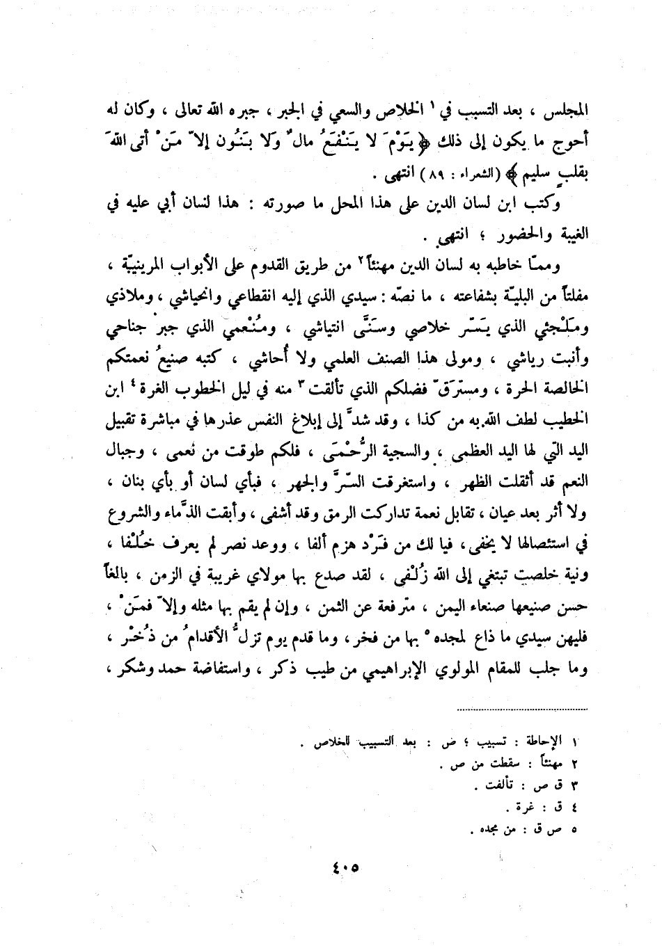 ومما خاطبه به لسان الدين مهنئاً (2) من طريق القدوم على الأبواب المرينية، مفلتاً من البلية بشفاعته، ما نصه: سيدي الذي إليه انقطاعي وانحياشي، وملاذي وملجئي الذي يسر خلاصي وسنى انتياشي، ومنعمي الذي جبر جناحي وأنبت رياشي، ومولى هذا الصنف العلمي ولا أحاشي، كتبه صنيع نعمكم الخالصة الحرة، ومسترق فضلكم الذي تألقت (3) منه في ليل الخطوب الغرة (4) ابن الخطيب لطف الله به من كذا، وقد شد إلى بلاغ النفس عذرها في مباشرة تقبيل اليد التي لها اليد العظمى، والسجية الرحمى، فلكم طوقت من نعمى، وجبال النعم قد أثقلت الظهر، واستغرقت السر والجهر، فبأي لسان أو بأي بنان، ولا أثر بعد عيان، تقابل نعمة تداركت الرمق وقد أشفى، وأبقت الذماء والشروع في استئصالها لا يخفى، فيا لك من فرد هزم ألفا، ووعد نصر لم يعرف خلفا، ونية خلصت تبتغي إلى الله زلفى، لقد صدع بها مولاي غريبة في الزمن، بالغاً حسن صنيعها صنعاء اليمن، مترفعة عن الثمن، وإن لم يقم بها مثله وإلا فمن، فليهن سيدي ما ذاع لمجده (5) بها من فخر، وما قدم يوم تزل الأقدام من ذخر، وما جلب للمقام المولوي الإبراهيمي من طيب ذكر، واستفاضة حمد وشكر،