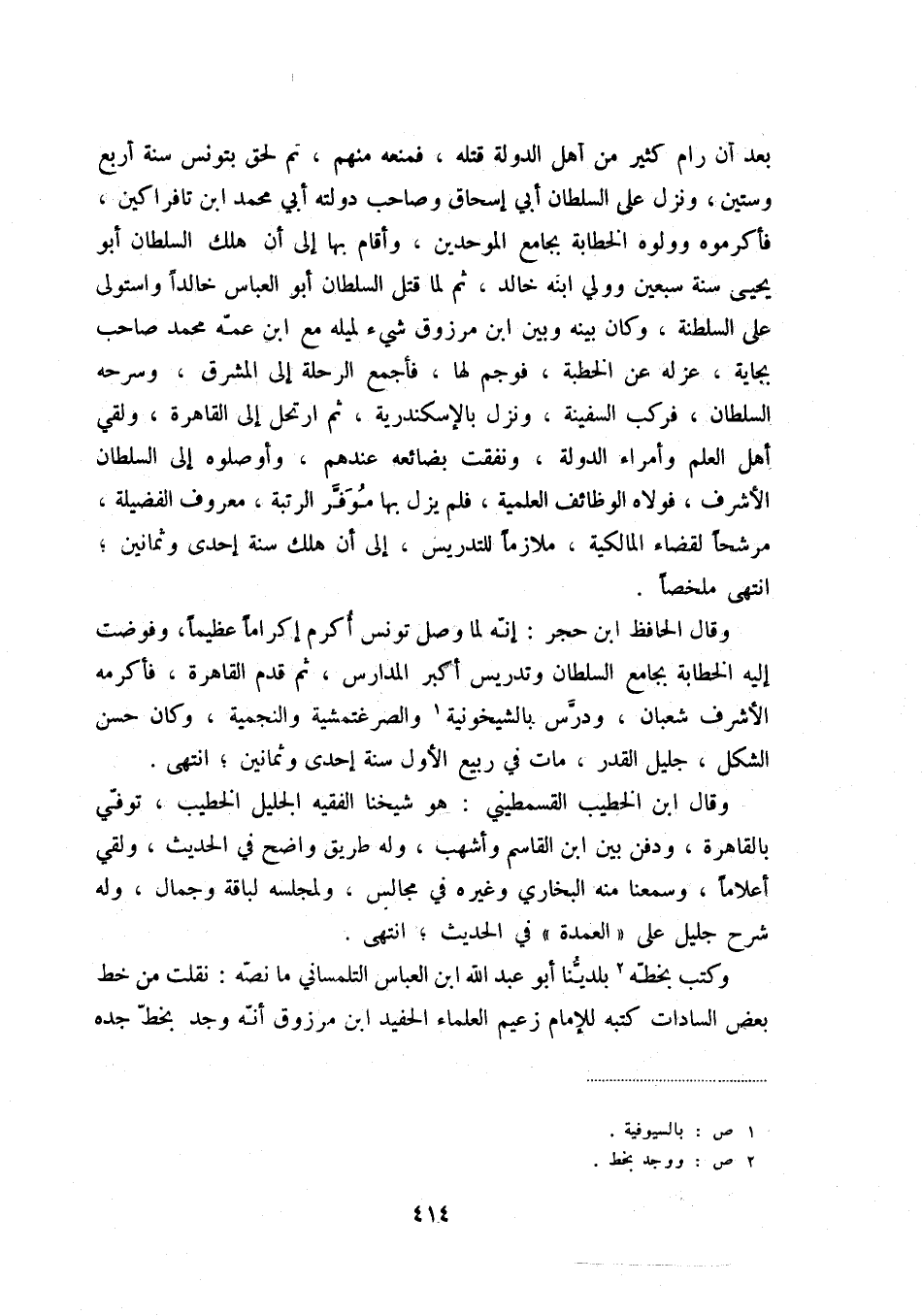 وقال الحافظ ابن حجر: إنه لما وصل تونس أكرم إكراماً عظيماً، وفوضت إليه الخطابة بجامع السلطان وتدريس أكبر المدارس، ثم قدم القاهرة، فأكرمه الأشرف شعبان، ودرس بالشيخونية (1) والصرغتمشية والنجمية، وكان حسن الشكل، جليل القدر، مات في ربيع الأول سنة إحدى وثمانين؛ ى انتهى.