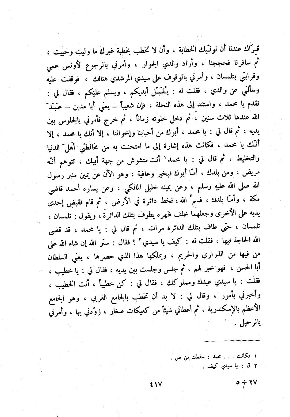قراك عندنا أن نوليك الخطابة، وأن لا تخطب بخطبة غيرك ما وليت وحييت، ثم سافرنا فحججنا، وأراد والدي الجوار، وأمرني بالرجوع لأونس عمي وقرابتي بتلمسان، وأمرني بالوقوف علي سيدي المرشدي هنالك، فوقفت عليه وسألني عن والدي، فقلت له: يقبل أيديكم، ويسلم عليكم، فقال لي: تقدم يا محمد، واستند إلى هذه النخلة، فإن شعيباً يعني أبا مدين عبد الله عندها ثلاث سنين، ثم دخل خلوته زماناً، ثم خرج فأمرني بالجلوس بين يديه، ثم قال لي: يا محمد، أبوك من أحبابنا وإخواننا، إلا أنك يا محمد، إلا أنك يا محمد، فكانت هذه إشارة إلى ما امتحنت به من مخالطة أهل الدنيا والتخليط، ثم قال لي: يا محمد (1) أنت متشوش من جهة أبيك، تتوهم أنه مريض، ومن بلدك، أما أبوك فبخير وعافية، وهو الآن عن يمين منبر رسول الله صلى الله عليه وسلم، وعن يمينه خليل المالكي، وعن يساره أحمد قاضي مكة، وأما بلدك، فبسم الله، فخط دائرة في الأرض، ثم قام فقبض إحدى يديه على الأخرى وجعلهما خلف ظهره يطوف بتلك الدائرة، ويقول: تلمسان، تلمسان، حتى طاف بتلك الدائرة مرات، ثم قال لي: يا محمد، قد قضى الله الحاجة فيها، فقلت له: كيف يا سيدي (2) فقال: ستر الله إن شاء الله على من فيها من الذراري والحريم، ويملكها هذا الذي حصرها، يعني السلطان أبا الحسن، فهو خير لهم، ثم جلس وجلست بين يديه، فقال لي: يا خطيب، فقلت: يا سيدي عبدك ومملوكك، فقال لي: كن خطيباً، أنت الخطيب، وأخبرني بأمور، وقال لي: لا بد أن تخطب بالجامع الغربي، وهو الجامع الأعظم بالإسكندرية، ثم أعطاني شيئاً من كعيكات صغار، زودني بها، وأمرني بالرحيل.