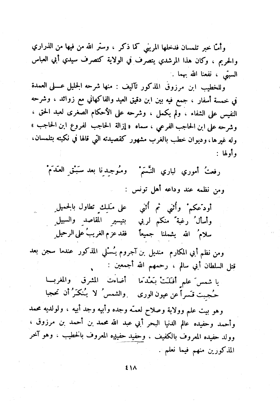 سلام الله يشملنا جميعاً ... فقد عزم الغريب على الرحيل ومن نظم أبي المكارم منديل ابن آجروم يسلس المذكور عندما سجن بعد قتل السلطان أبي سالم، رحمهم الله أجمعين: