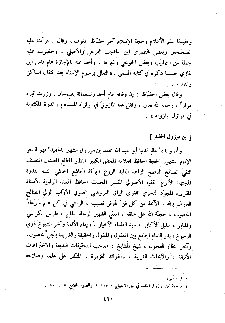 وأما والده (1) عالم الدنيا أبو عبد الله محمد بن مرزوق الشهير بالحفيد (2) فهو البحر الإمام المشهور الحجة الحافظ العلامة المحقق الكبير النظار المطلع المصنف المنصف التقي الصالح الناصح الزاهد العابد الورع البركة الخاشع الخاشي النبيه القدوة المجتهد الأبرع الفقيه الأصولي المفسر المحدث الحافظ المسند الراوية الأستاذ المقرئ المجود النحوي اللغوي البياني العروضي الصوفي الأواب الولي الصالح العارف بالله، الآخذ من كل فن بأوفر نصيب، الراعي في كل علم مرعاه الخصيب، حجة الله على خلقه، المفتي الشهير الرحلة الحاج، فارس الكراسي والمنابر، سليل الأكابر، سيد العلماء الأخيار، وإمام الأئمة وآخر الشيوخ ذوي الرسوخ، بدر التمام الجامع بين المعقول والمنقول والحقيقة والشريعة بأجل محصول، وآخر النظار الفحول، شيخ المشايخ، صاحب التحقيقات البديعة والاختراعات الأنيقة، والأبحاث الغريبة، والفوائد الغزيرة، المتفق على علمه وصلاحه