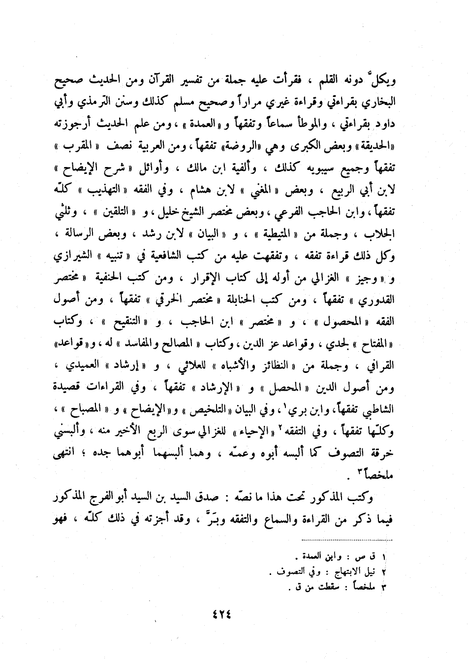 ويكل دونه القلم، فقرأت عليه جملة من تفسير القرآن ومن الحديث صحيح البخاري بقراءتي وقراءة غيري مراراً وصحيح مسلم كذلك وسنن الترمذي وأبي داود بقراءتي، والموطأ سماعاً وتفقهاً والعمدة، ومن علم الحديث أرجوزته الحديقة وبعض الكبرى وهي الروضة تفقهاً، ومن العربية نصف المقرب تفقهاً وجميع سيبويه كذلك، وألفية ابن مالك، وأوائل شرح الإيضاح لابن أبي ربيع، وبعض المغني لابن هشام، وفي الفقه التهذيب كله تفقهاً، وابن الحاجب الفرعي، وبعض مخنصر الشيخ خليل، والتلقين، وثلثي الجلاب، وجملة من المتيطية، والبيان لابن رشد، وبعض الرسالة، وكل ذلك قراءة تفقه، وتفقهت عليه من كتاب الشافعية في تنبيه الشيرازي ووجيز الغزالي من أوله إلى كتاب الإقرار، ومن كتب الحنفية مختصر القدوري تفقهاً، ومن كتب الحنابلة مختصر الخرقي تفقهاً، ومن أصول الفقه المحصول، ومختصر ابن الحاجب، والتنقيح، وكتاب المفتاح لجدي، وقواعد عز الدين، وكتاب المصالح والمفاسد له، وقواعد القرافي، وجملة من النظائر والأشباه للعلائي، وإرشاد العميدي، ومن أصول الدين المحصل والإرشاد تفقهاً، وفي القراءات قصيدة الشاطبي تفقهاً، وابن بري (1) ، وفي البيان التلخيص والإيضاح والمصباح، وكلها تفقهاً وفي التفقه (2) الإحياء للغزالي سوى الربع الأخير منه، وألبسني خرقة التصوف كما ألبسه أبوه وعمه، وهما ألبسهما أبوهما وجده؛ انتهى ملخصاً (3) .