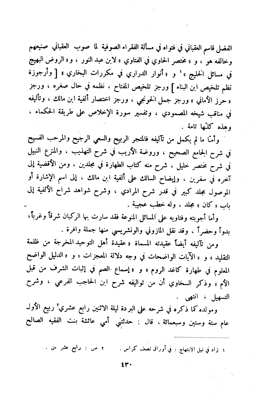 الفضل قاسم العقباني في فتواه في مسألة الفقراء الصوفية لما صوب العقباني صنيعهم وخالفه هو، ومختصر الحاوي في الفتاوي لابن عبد النور، و " الروض البهيج في مسائل الخليج " (1) وأنوار الدراري في مكررات البخاري [وأرجوزة نظم تلخيص ابن البناء] ورجز تلخيص المفتاح، نظمه في حال صغره، ورجز حرز الأماني ورجز جمل الخونجي، ورجز اختصار ألفية ابن مالك، وتأليفه في مناقب شيخه المصمودي، وتفسير سورة الإخلاص على طريقة الحكماء، وهذه كلها تامة.