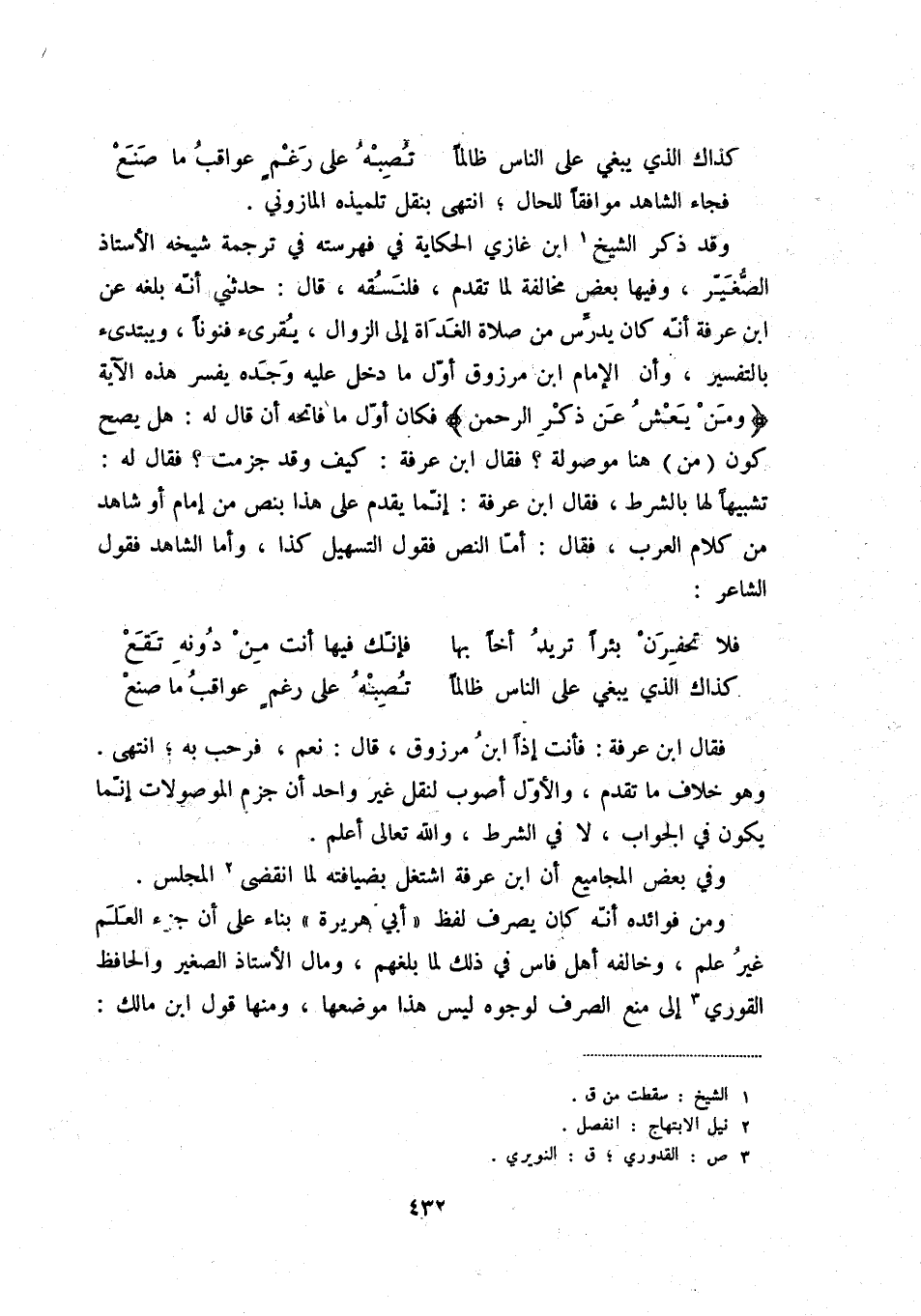 وقد ذكر الشيخ (1) ابن غازي الحكاية في فهرسته في ترجمة شيخه الأستاذ الصغير، وفيها بعض مخالفة لما تقدم، فلنسقه، قال: حدثني أنه بلغه عن ابن عرفة أنه كان يدرس من صلاة الغداة إلى الزوال، يقرئ فنون، ويبتدئ بالتفسير، وإن الإمام ابن مرزوق أول ما دخل عليه وجده يفسر هذه الآيات " ومن يعش عن ذكر الرحمن " فكان أول ما فاتحه أن قال له: هل يصح كون من هنا موصولة فقال ابن عرفة: كيف وقد جزمت فقال: تشبيهاً له بالشرط، فقال ابن عرفة: إنما يقدم على هذا بنص من إمام أو شاهد من كلام العرب، فقال: إما النص فقول التسهيل كذا، وأما الشاهد فقول: الشاعر: