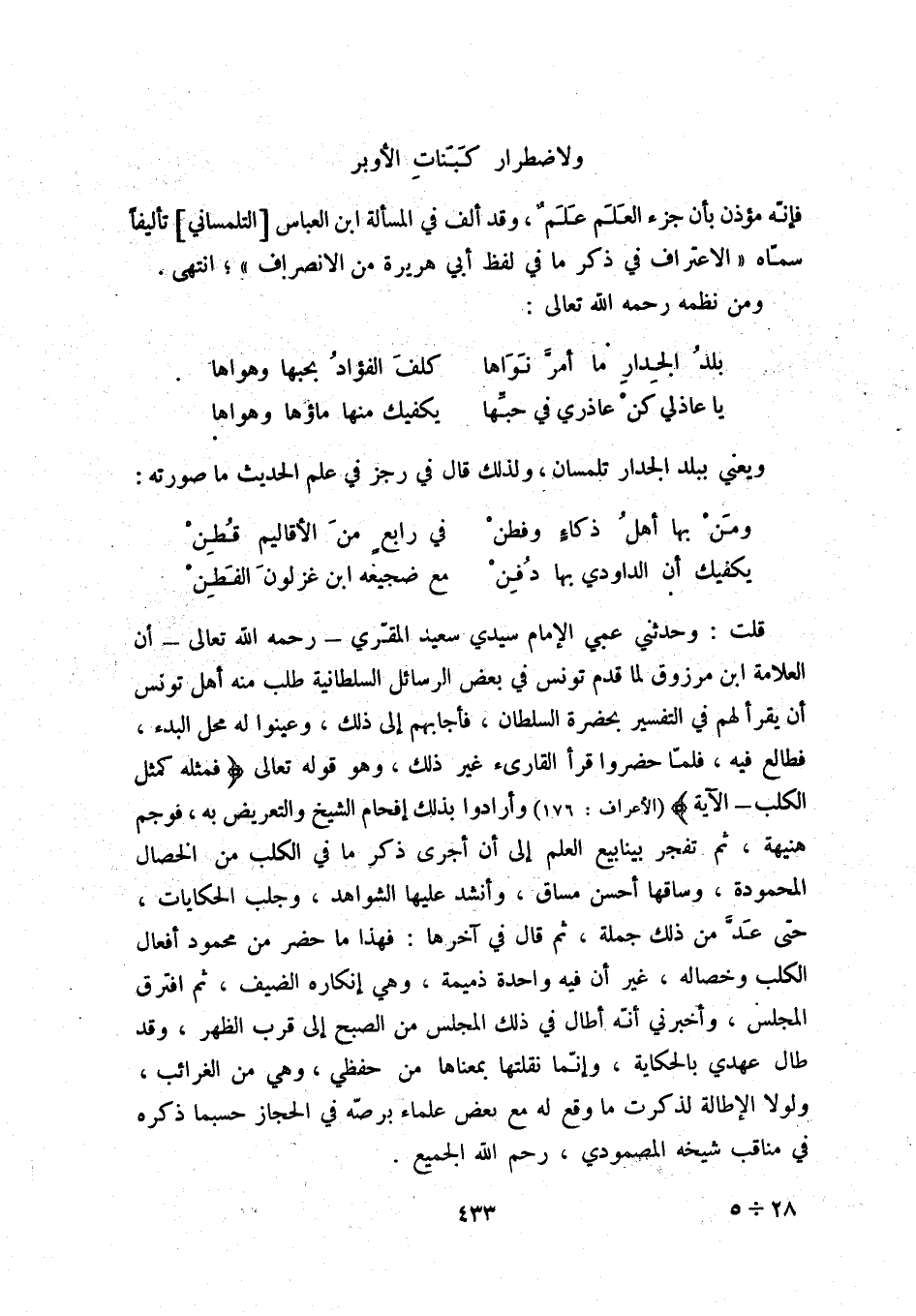 ولاضطرار كبنات الأوبر ... فإنه مؤذن بأن جزء العلم علم، وقد ألف في المسألة ابن عباس التلمساني تأليفاً سماه الاعتراف في ذكر ما لفظ أبي هريرة من الانصراف؛ انتهى.