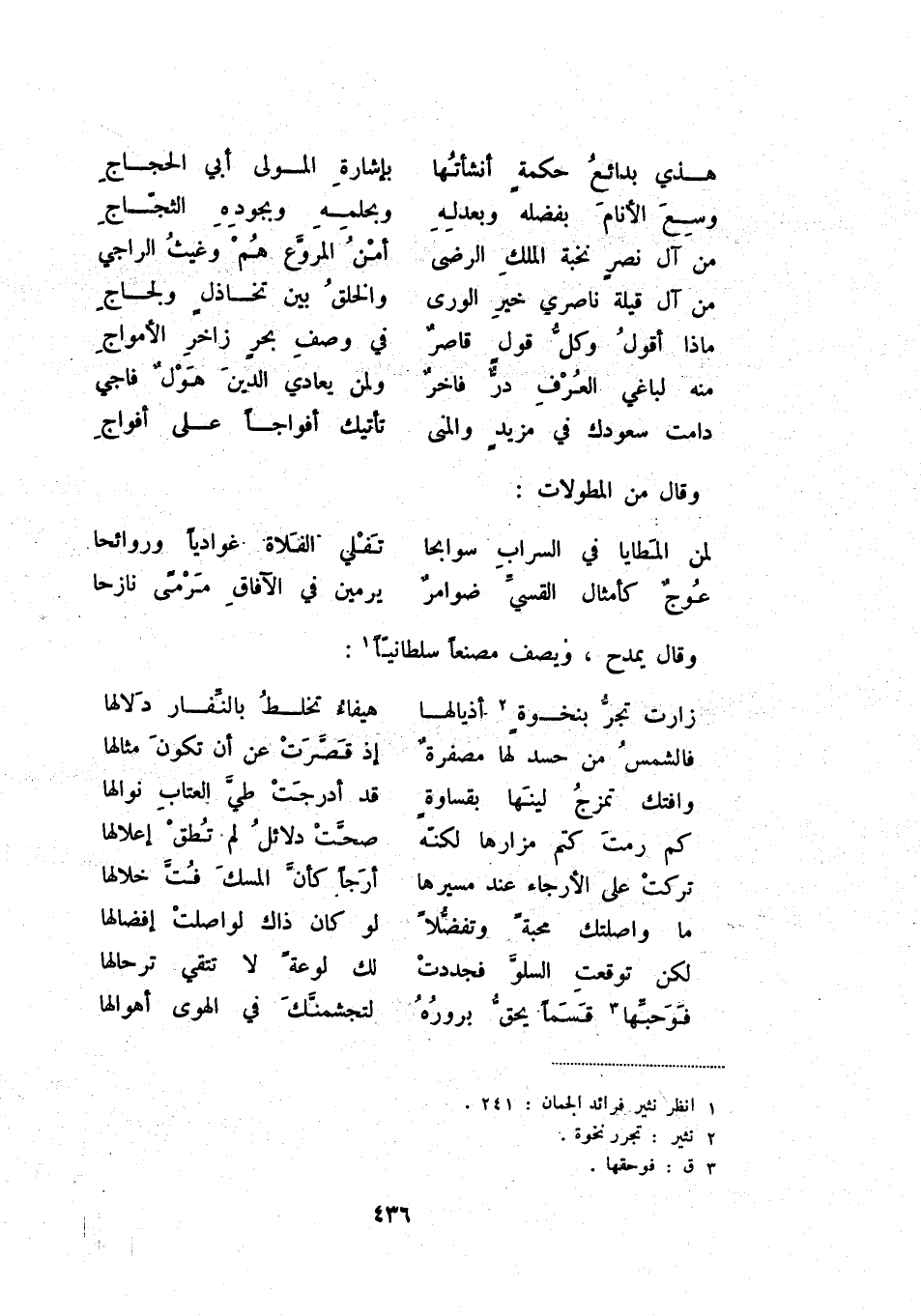 دامت سعودك في مزيد والمنى ... تأتيك أفواجاً على أفواج وقال من المطولات: