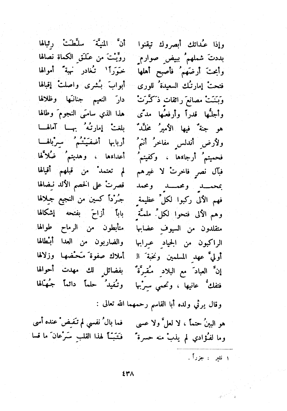 فتفك عانيها، وتحمي سربها ... وتفيد حلماً دائماً جهالها وقال يرثي ولده أبا القاسم رحمهما الله تعالى: