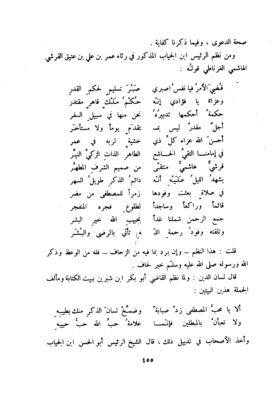 وتلقته وفود رحمة الل ... هـ تأتي بالرضى والبشر قلت: هذا النظم - وإن برد بما فيه من الزحاف - فله من الوعظ وذكر الله ورسوله صلى الله عليه وسلم خير لحاف.