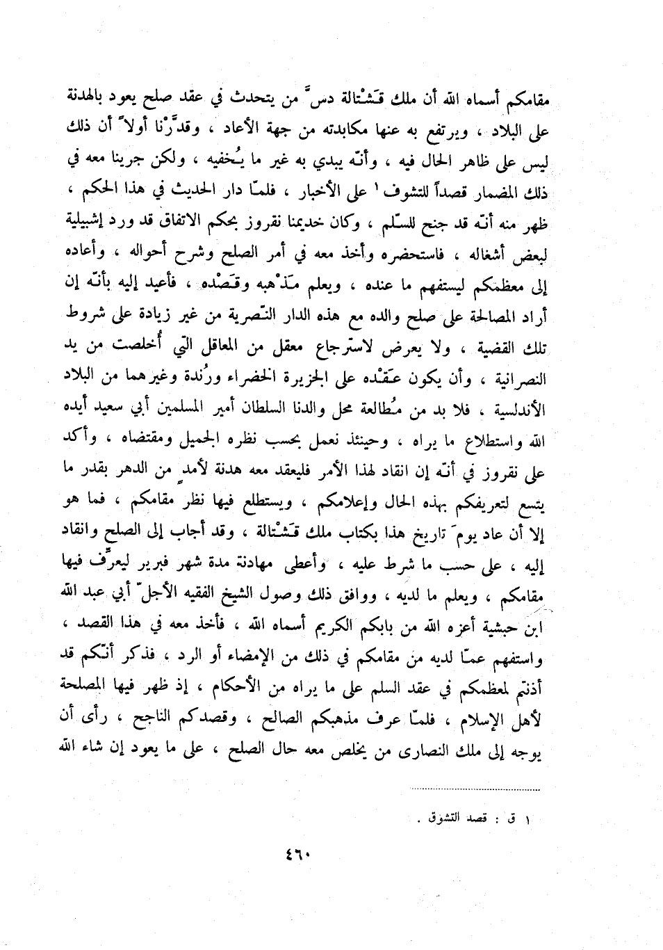 مقامكم أسماه الله أن ملك قشتالة دس من يتحدث في عقد صلح يعود بالهدنة على البلاد، ويرتفع به عنها مكابدته من جهة الأعاد، وقد رنا أولاً أن ذلك ليس على ظاهر الحال فيه، وأنه يبدي به غير ما يخفيه، ولكن جرينا معه في ذلك المضمار قصداً للتشوف (1) على الأخبار، فلما دار الحديث في هذا الحكم، ظهر منه أنه قد جنح للسلم، وكان خديمنا نقروز بحكم الاتفاق قد ورد إشبيلية لبعض أشغاله، فاستحضره وأخذ معه في أمر الصلح وشرح أحواله، وأعاده إلى معظمكم ليستفهم ما عنده، ويعلم مذهبه وقصده، فأعيد إليه بأنه إن أراد المصالحة على صلح والده على هذه الدار النصرية من غير زيادة على شروط تلك القضية، ولا يعرض لاسترجاع معقل من المعاقل التي أخلصت من يد النصرانية، وأن يكون عقده على الجزيرة الخضراء ورندة وغيرهما من البلاد الأندلسية، فلا بد من مطالعة محل والدنا السلطان أمير المسلمين أبي سعيد أيده الله واستطلاع ما يراه، وحينئذ نعمل بحسب نظره الجميل ومقتضاه، وأكد على نقروز في أنه إن انقاد لهذا الأمر فليعقد معه هدنة لأمد من الدهر بقدر ما يتسع لتعريفكم بهذه الحال وإعلامكم، ويستطلع فيها نظر مقامكم، فما هو إلا أن عاد يوم تاريخ هذا بكتاب ملك قشتالة، وقد أجاب إلى الصلح وانقاد إليه، على حسب ما شرط عليه، وأعطى مهادنة مدة شهر فبرير ليعرف فيها مقامكم، ويعلم ما لديه، ووافق ذلك وصول الشيخ الفقيه الأجل أبي عبد الله ابن حبشية أعزه الله من بابكم الكريم أسماه الله، فأخذ معه في هذا القصد، واستفهم عما لديه من مقامكم في ذلك من الإمضاء أو الرد، فذكر أنكم قد أذنتم لمعظمكم في عقد السلم على ما يراه من الأحكام، إذ ظهر فيها المصلحة لأهل الإسلام، فلما عرف مذهبكم الصالح، وقصدكم الناجح، رأى أن يوجه إلى ملك النصارى من يخلص معه حال الصلح، على ما يعود إن شاء الله